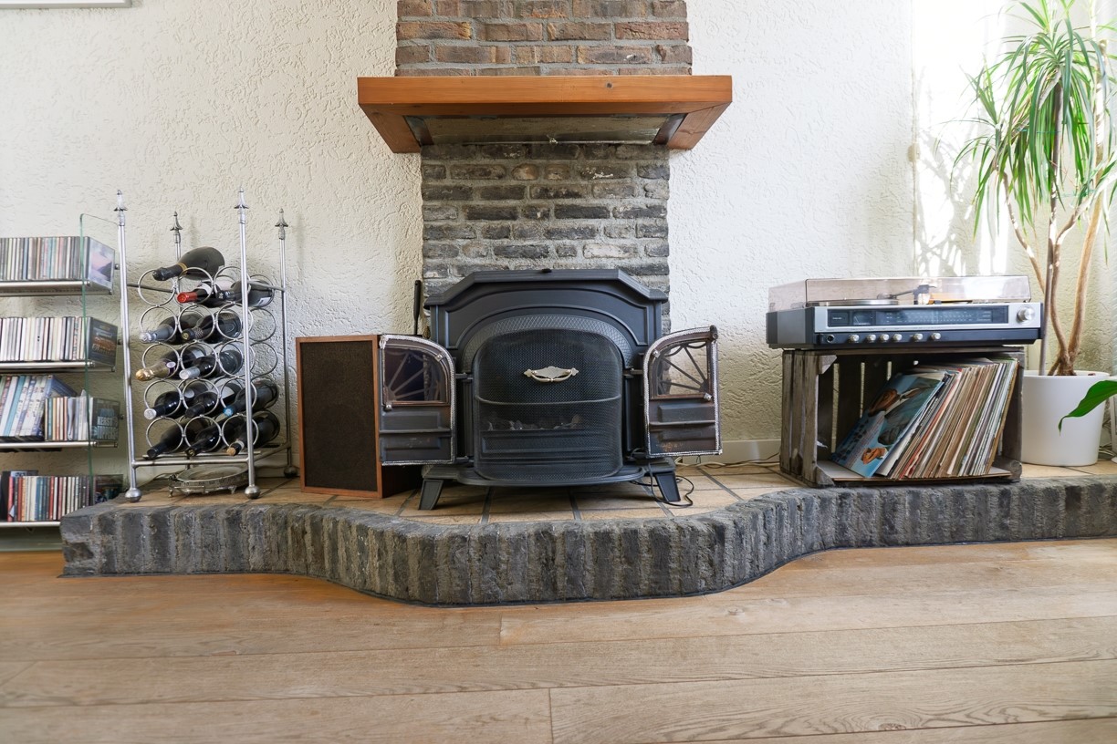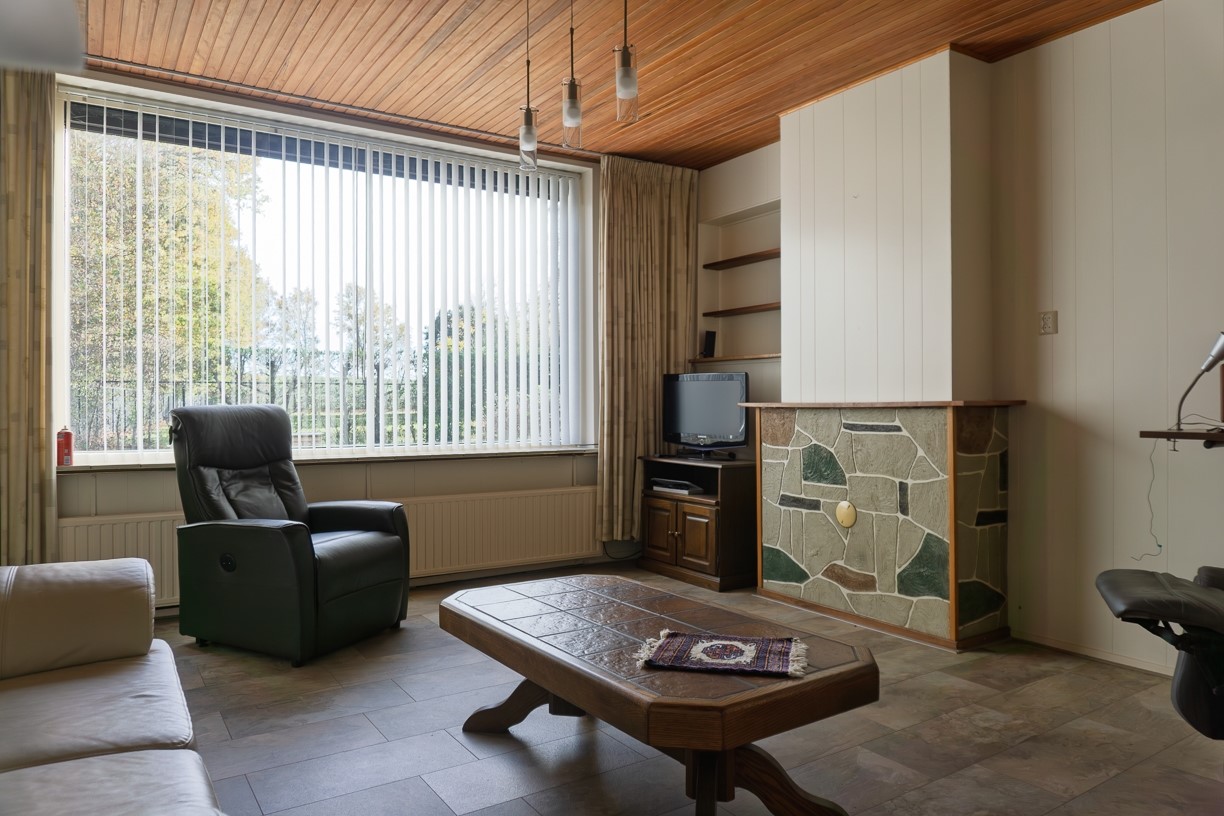 De knusse woonkamer ligt aan de voorzijde van de woning en beschikt over een schouw welke niet in gebruik is. De afwerking bestaat uit wanden zie zijn afgewerkt met houtdelen en granol, laminaat op de vloer en schrootjes aan het plafond.