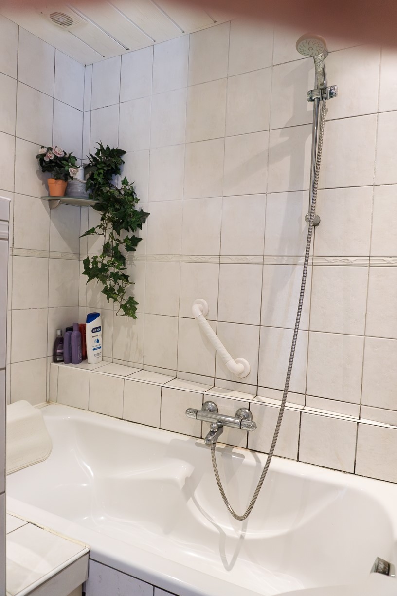 Naast de keuken is een hal die leidt naar de achtertuin. Aan deze hal is de badkamer gelegen. Dit betreft een inloopdouche met wastafel. De badkamer is tot 3/4e hoogte betegeld met hierboven stucwerk. Het plafond is afgewerkt met schroten. Naast de badkamer ligt het (separate) toilet. Dit betreft een closetpot met klassieke stortbak.