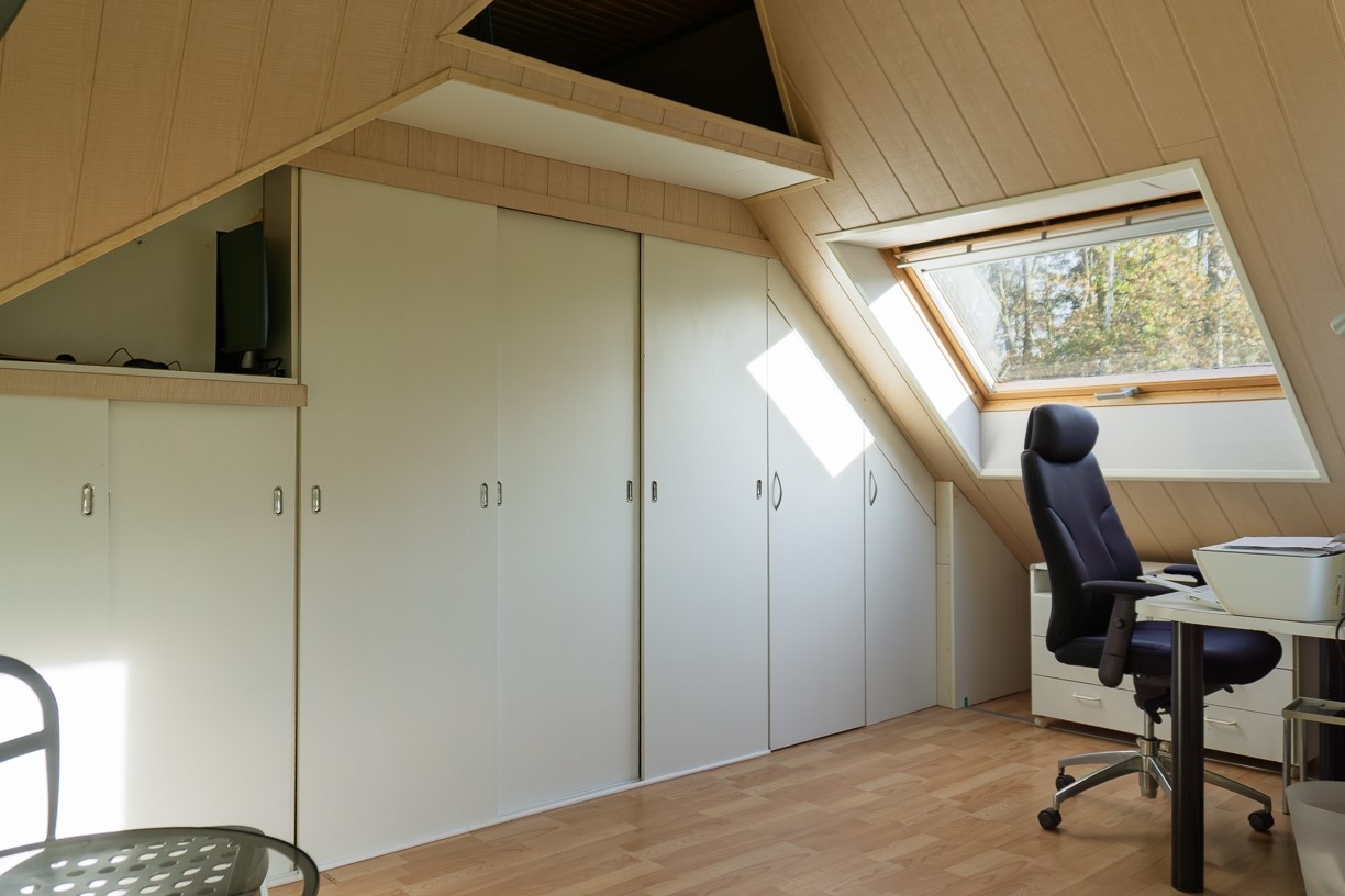 De trapopgang in de hal komt uit op de overloop van de 1e verdieping. De overloop geeft toegang tot een slaapkamer. Verder is op de overloop in de schuinten van de dakvlakken veel bergruimte aanwezig door de aangebrachte knieschotten.