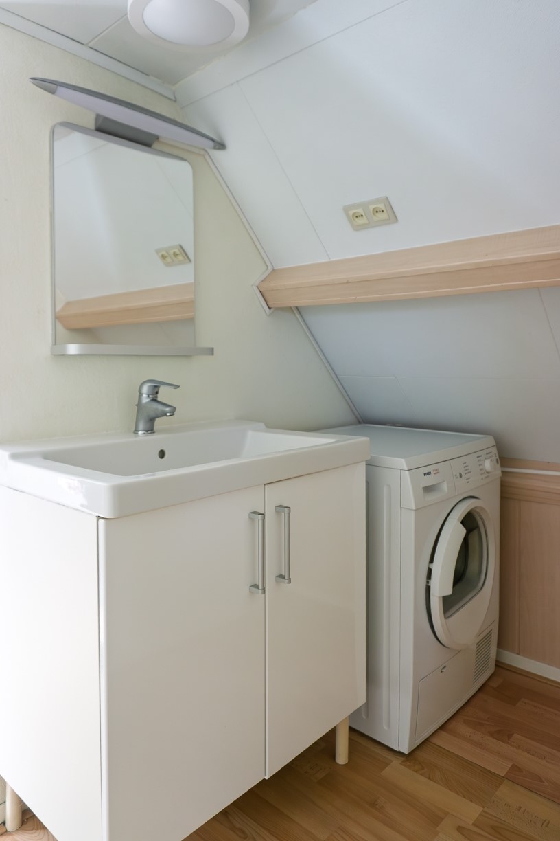 De trapopgang in de woonkamer komt uit op de 1e verdieping. Hier bevinden zich 3 slaapkamers en een ruimte waar de aansluiting is voor de wasdroger en een wastafel hangt.