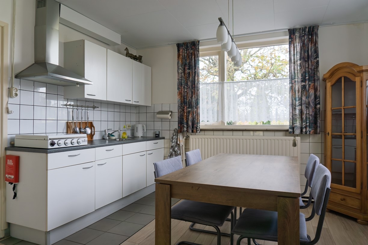 De keuken is royaal en kan als woon-/leefkeuken worden bestempeld. De keuken geeft toegang tot de bijkeuken, een hal die naar de woonkamer leidt en via een portaal tot de achtertuin. Door het grote raam is uitzicht op de achtertuin en de achtergelegen wei. De hoek opgestelde keuken beschikt over een kunststof werkblad met dubbele spoelbak en onder- en bovenkasten. Ingebouwd zijn een 5 pits gaskooktoestel met hierboven de afzuigkap, een vaatwasser, een combi-oven/grill/magnetron en een koelkast. De afwerking van de keuken bestaat uit deels betegelde wanden en deels uit gestucte wanden, een houtdelen op de vloer en MDF-panelen aan het plafond.