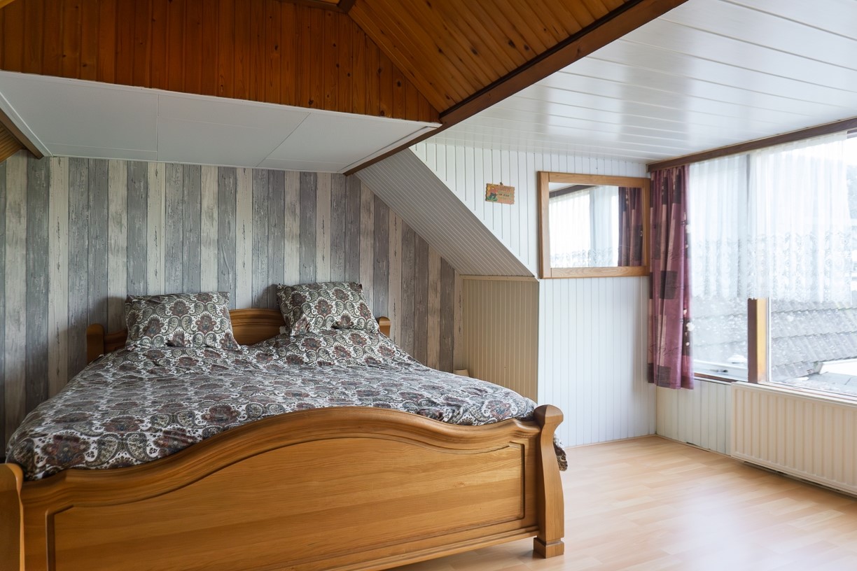 De ruime slaapkamer geeft via de grote dakkapel een mooi uitzicht over de wei achter de woning. De slaapkamer is afgewerkt met behang op de wanden, laminaat op de vloer en schroten aan de dakvlakken.