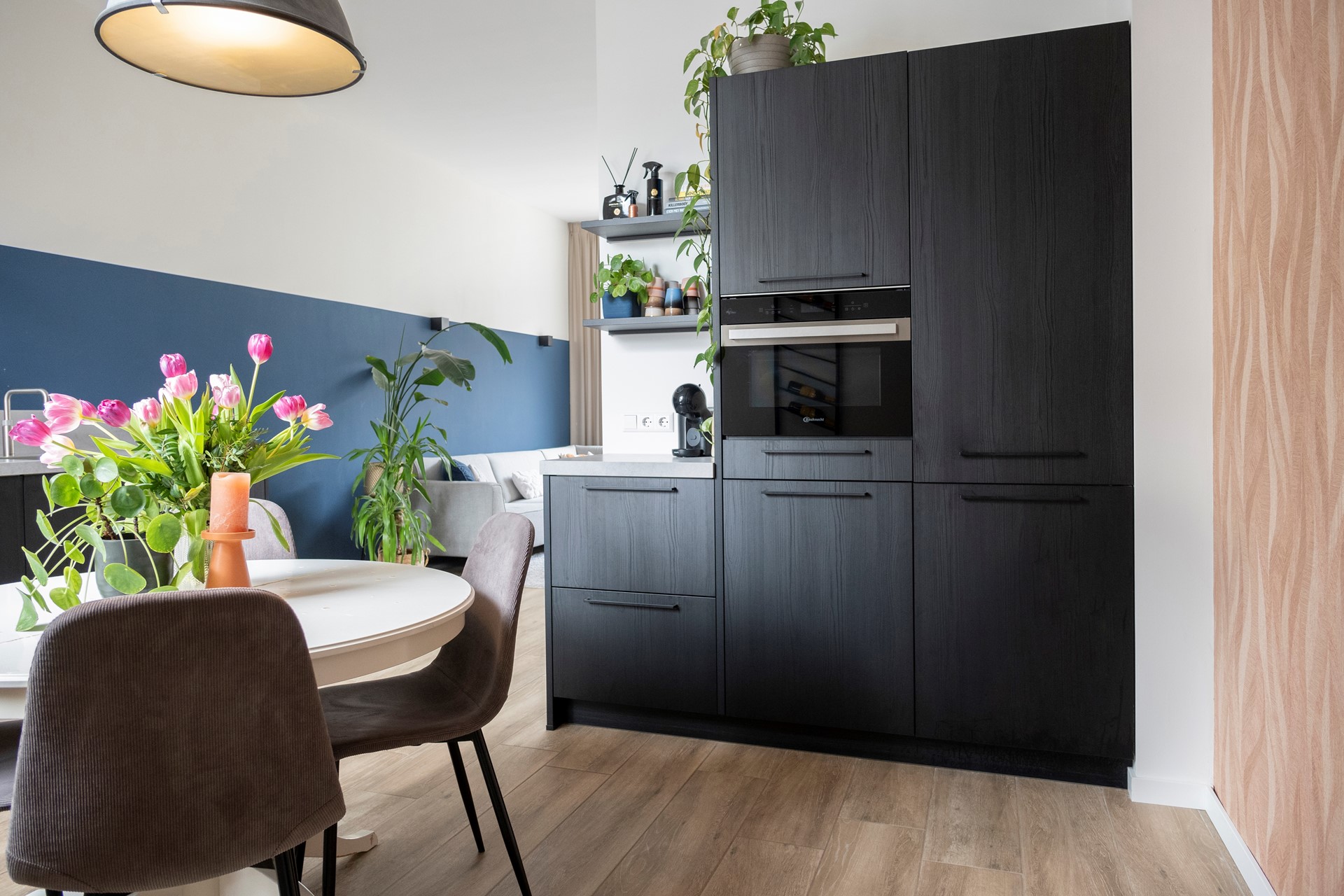 De ruime, open keuken is aan de achterzijde van de woning gelegen en kijkt via het raam uit op de achtertuin. Door de grootte van de keuken kan met recht worden gesproken van een woon-/leefkeuken. Het keukenblok is in 2 delen langs de wand geplaatst. Het beschikt over een kunststof werkblad met spoelbak en Quooker mengkraan. Ingebouwd zijn een 4-pits inductie kookplaat met directe afzuiging en een vaatwasser. In de kastenwand is een combi oven/grill/magnetron ingebouwd en een koel-/vriescombinatie. De keuken is op dezelfde wijze afgewerkt als de woonkamer inclusief de vloerverwarming.