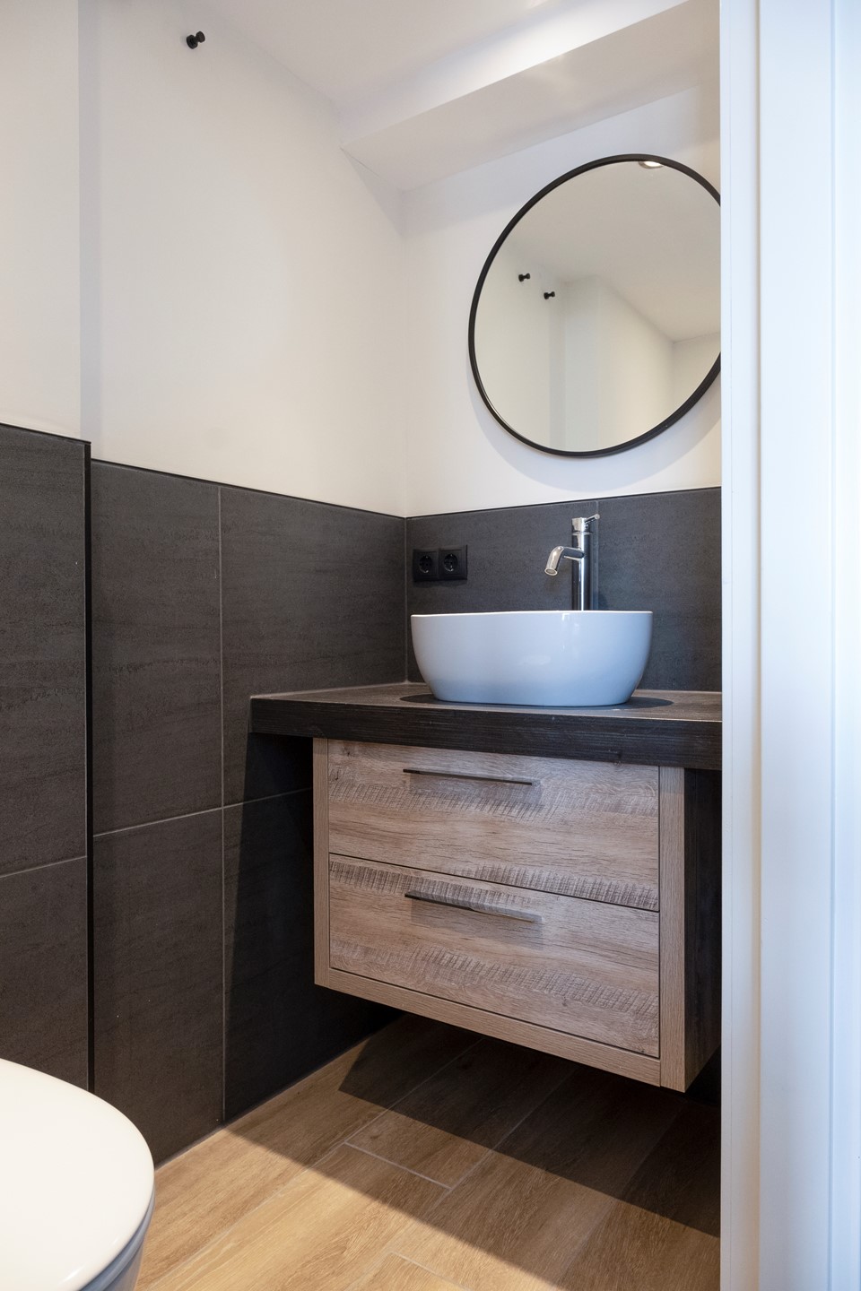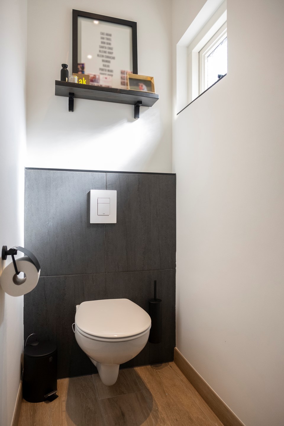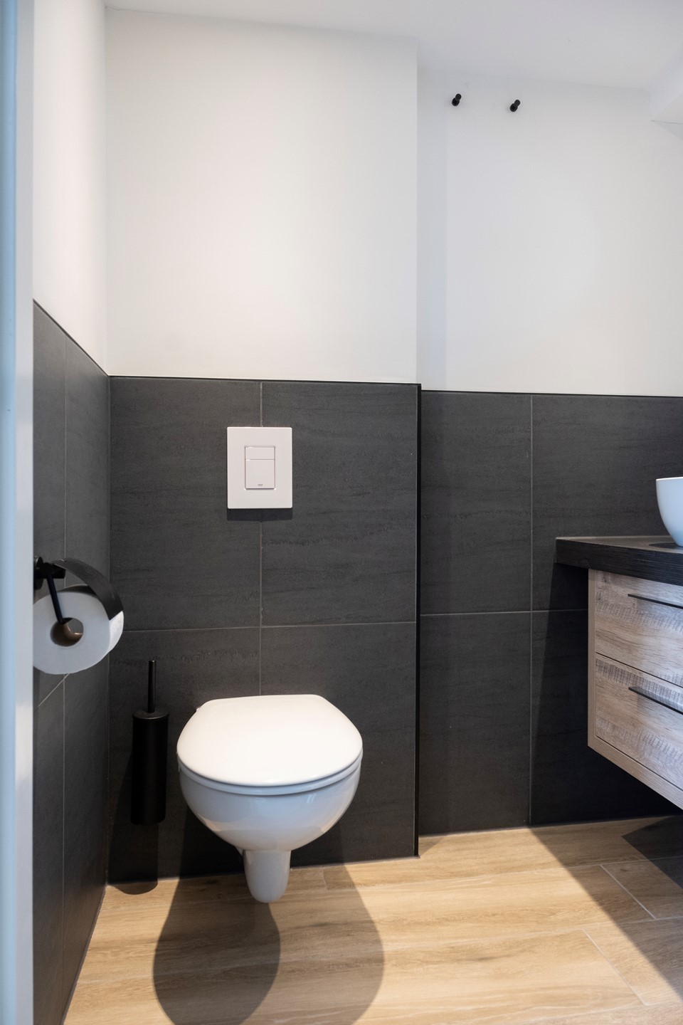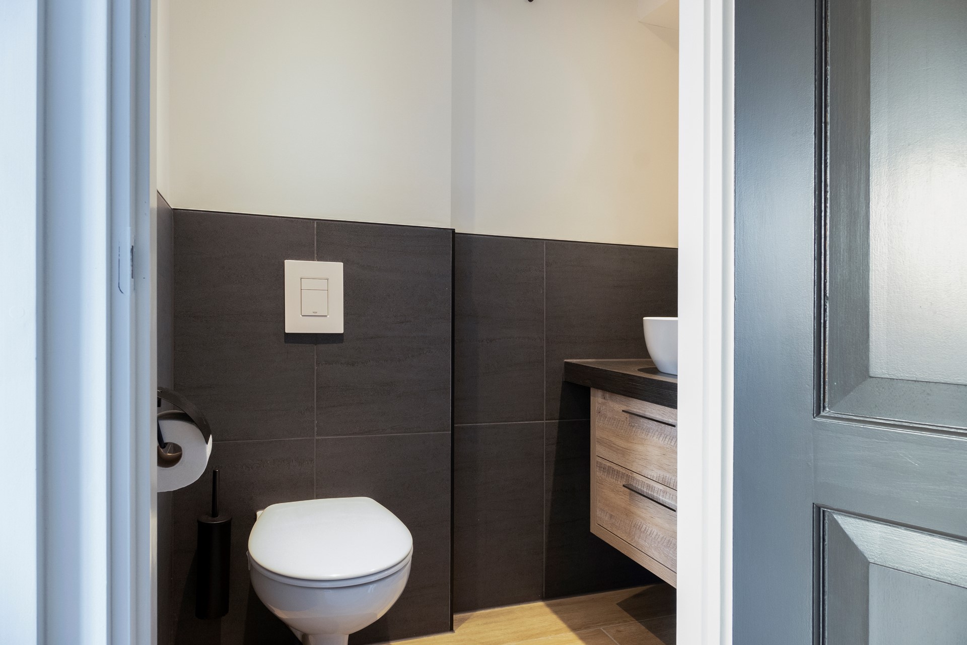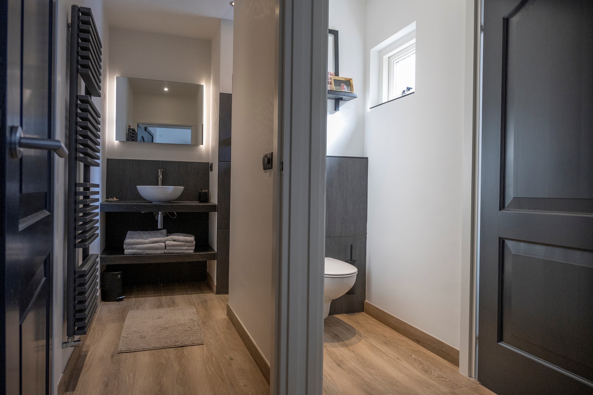 De overloop geeft toegang tot een toilet. Dit is uitgerust met een hangcloset en een wastafel.