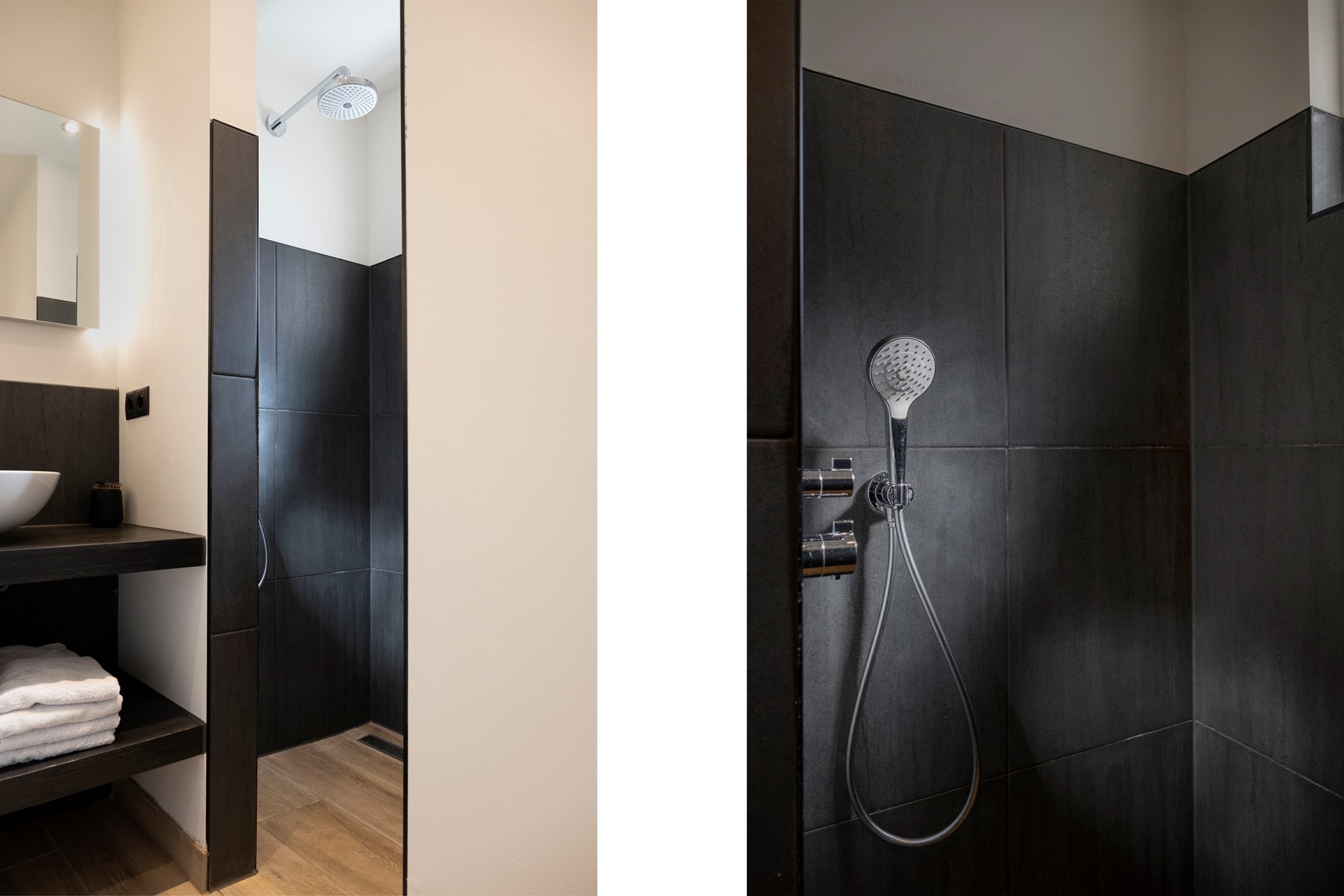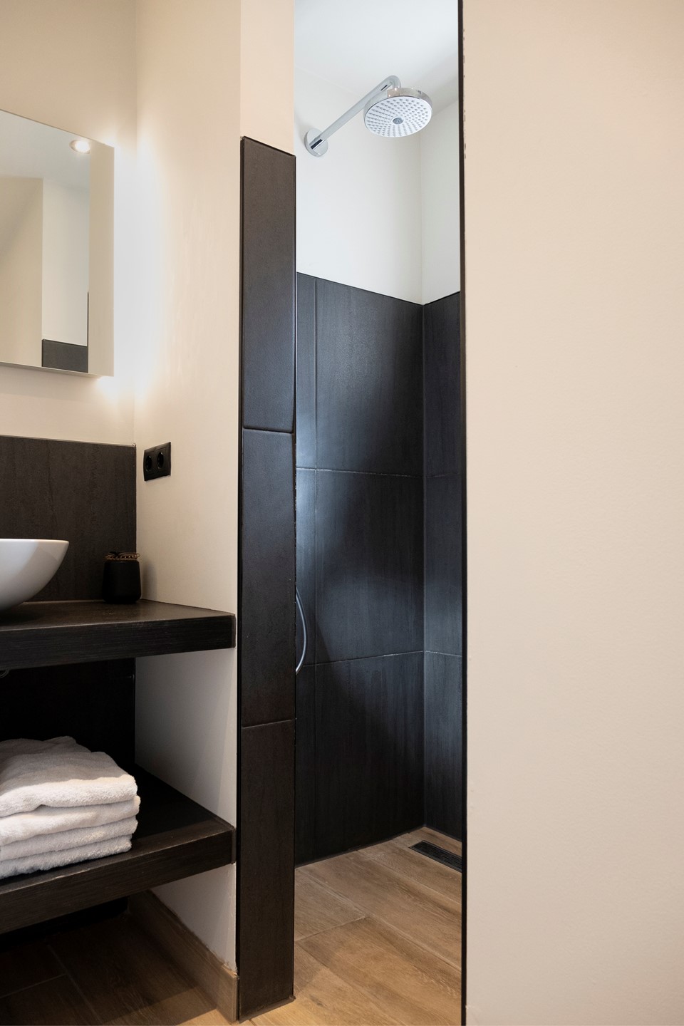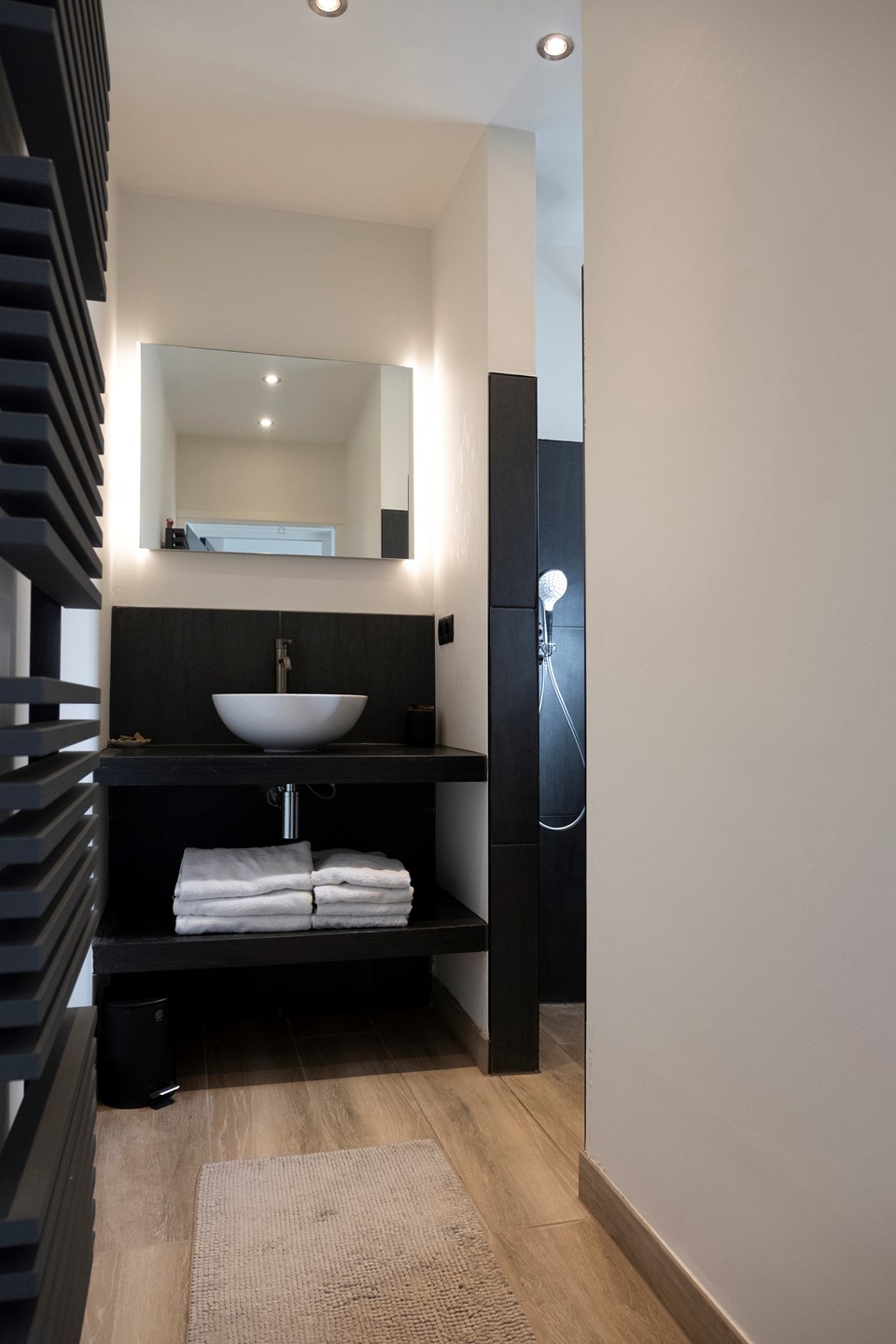 In de aanbouw van de woning is het toilet en de badkamer gesitueerd. Het toilet betreft een hangcloset en is deels betegeld en deels afgewerkt met strak stucwerk. De met een designaradiator verwarmde badkamer heeft een moderne inloopdouche met regendouche en handsproeier en een wastafel ingebouwd in een badmeubel. De aanbouw geeft toegang tot de achtertuin.