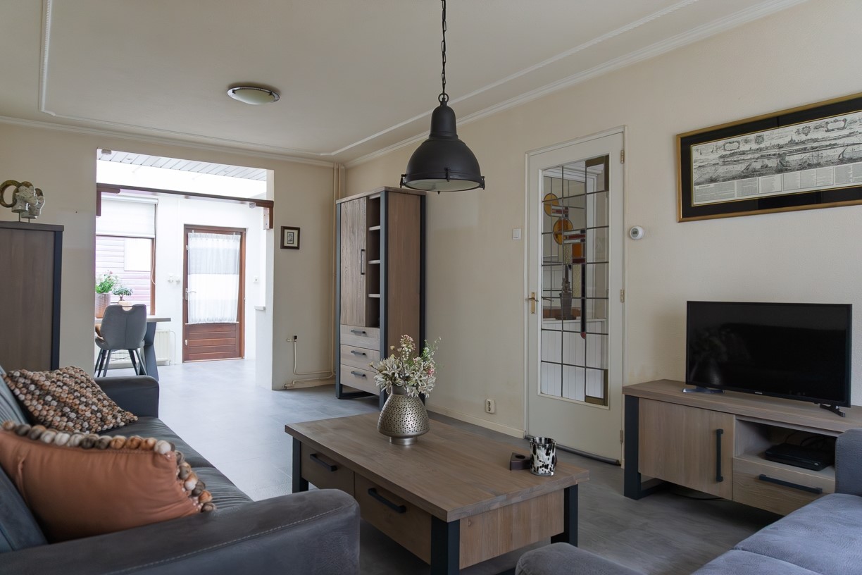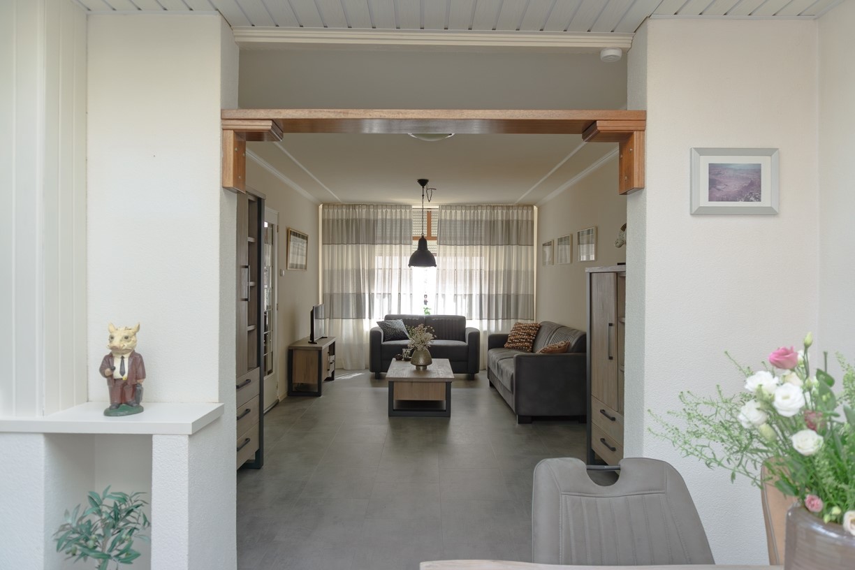 De woonkamer wordt gedeeltelijk onderbroken door een muur waar voorheen het kozijn zat van de woning. Door de uitbouw, voorzien van een lichtstraat, is het een ruime, gezellige woonkamer. De achterzijde van de woonkamer geeft toegang tot de achtertuin. De afwerking bestaat uit spachtelputz op de wanden en plafond en pvc tegels op de vloer. In de uitbouw bestaat de plafond afwerking uit MDF-panelen.