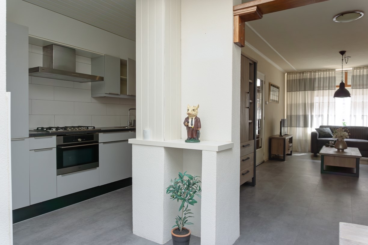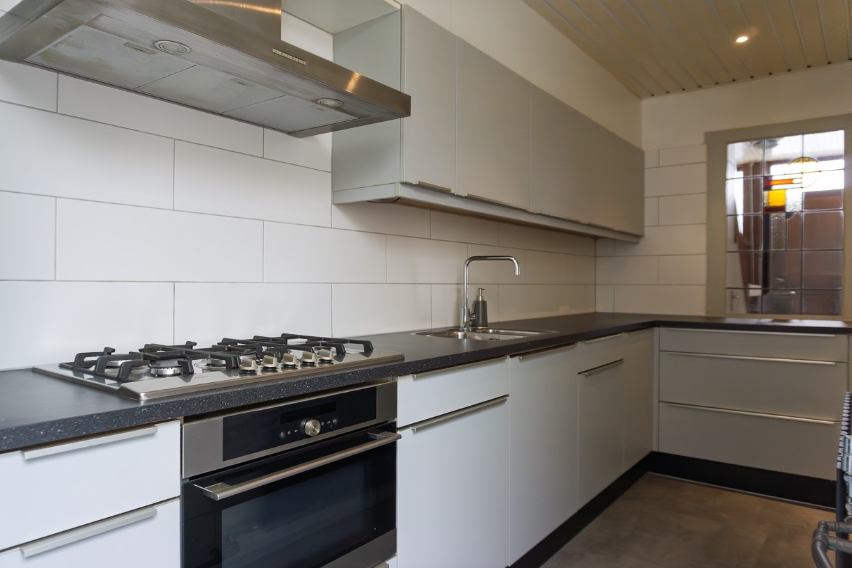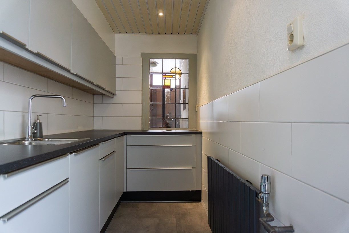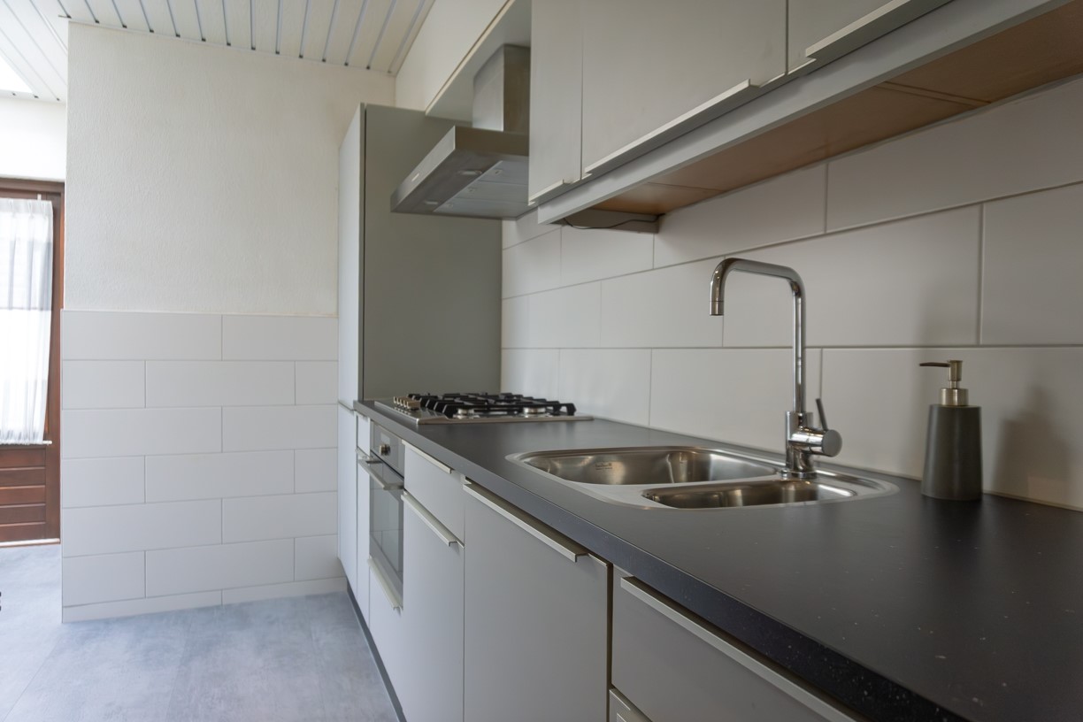 De keuken staat in open verbinding met het uitgebouwde deel van de woonkamer. De keukenopstelling is in 2019 vernieuwd en bestaat uit in een hoek opgesteld keukenblok met onder- en bovenkasten en een kunststof werkblad met spoelbak en mengkraan. Ingebouwd zijn een 5-pits gaskookplaat met afzuigkap, een combi-oven/grill en een koel-/vriescombinatie. De keuken is op dezelfde wijze afgewerkt als de woonkamer.