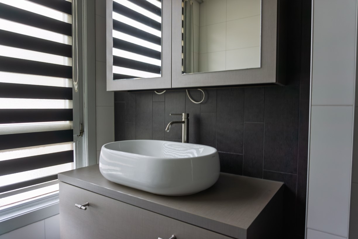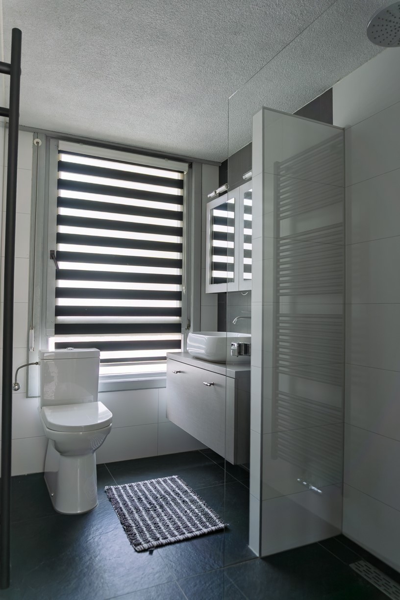 De badkamer lig naast slaapkamer 2 aan de achterzijde van de woning en is recent vernieuwd. De badkamer beschikt nu over een inloopdouche met regendouche en handsproeier en een hardglazen scheidingswand, een waskom op een badkamermeubel en een toilet. De badkamer is in neutrale kleuren betegeld.