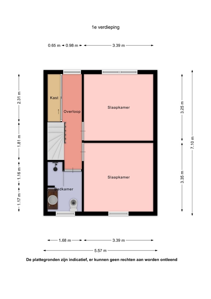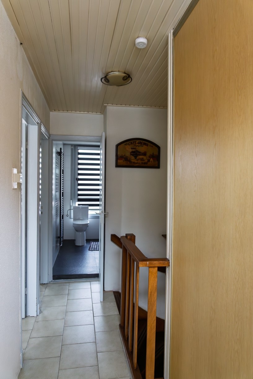 De trapopgang in de hal komt uit op de langgerekte overloop van de 1e verdieping. Op de overloop is een grote vaste kast aanwezig waar veel spullen kunnen worden opgeborgen. De overloop geeft toegang tot 2 slaapkamers en de badkamer.