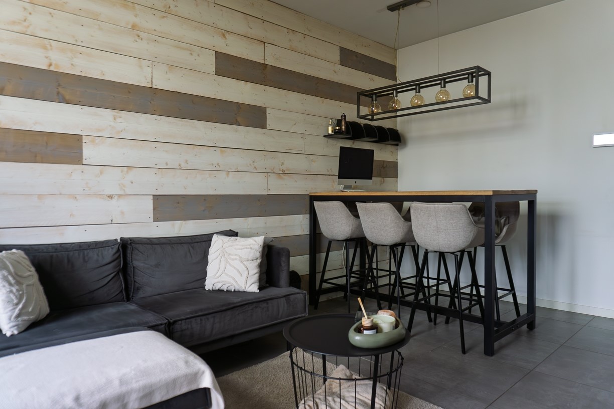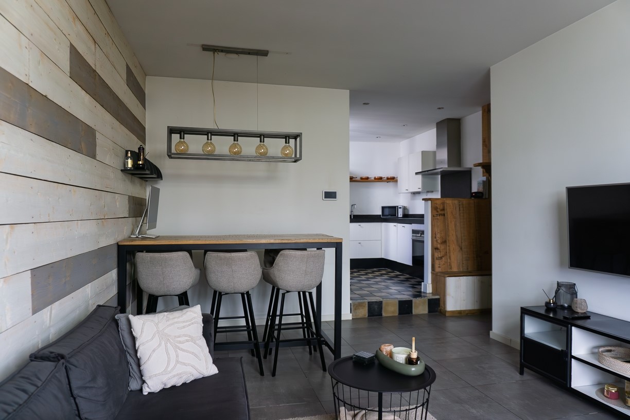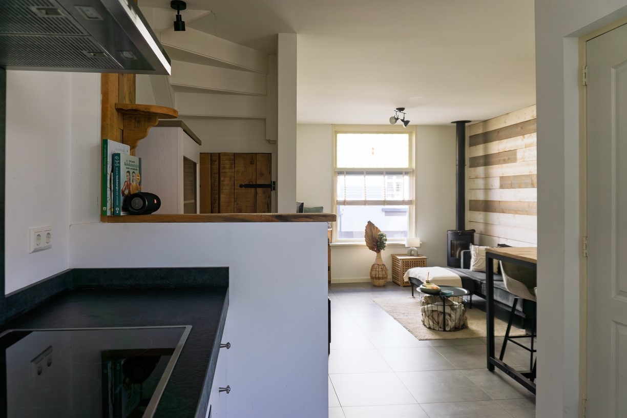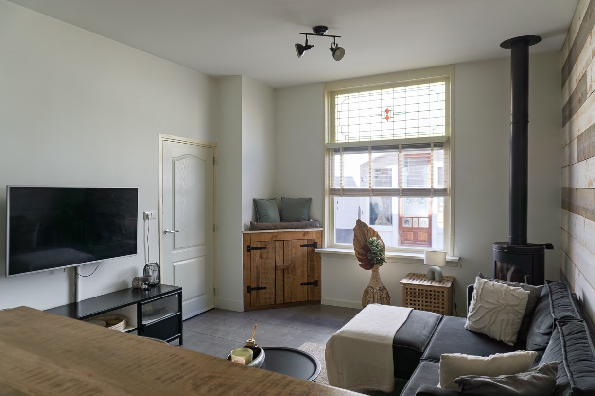 De hal biedt toegang aan de gezellige woonkamer. In de hoek van de woonkamer staat een houtkachel die voor extra sfeer zorgt. De woonkamer biedt plaats voor een zithoek en een eettafel en is afgewerkt met stucwerk op de wanden, 1 wand is stoer afgewerkt met steigerplanken en de vloer is betegeld. De woonkamer staat in open verbinding met de keuken. Aan de zijkant van de woonkamer is een vaste bergkast aanwezig.