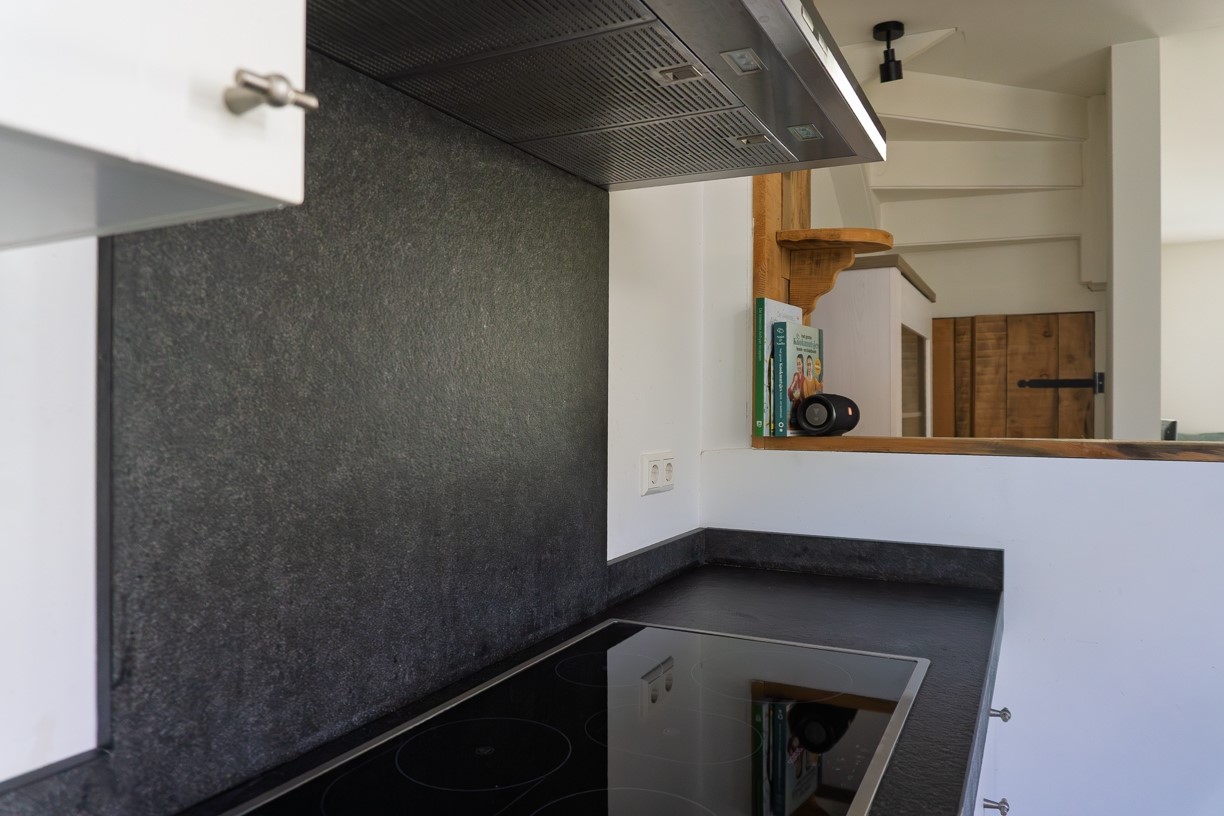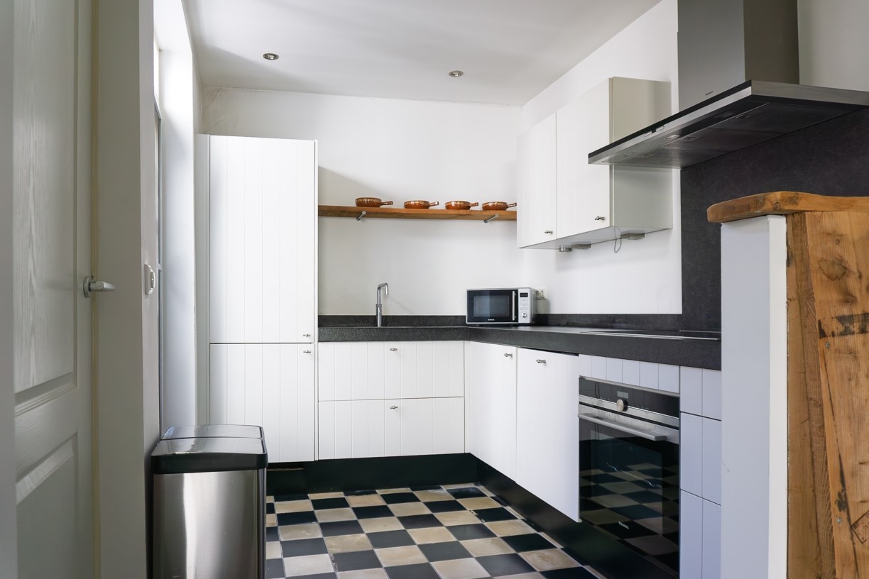 De keuken ligt een trede hoger dan de woonkamer en ook hier ligt nog een originele tegelvloer. De keuken is in een hoek tegen de wand opgesteld en beschikt over een kunststof werkblad met spoelbak en Quooker mengkraan. Ingebouwd zijn een 5-pits inductie kookplaat, een afzuigkap, een vaatwasser, een combi-oven/grill/magnetron en een koel-/vriescombinatie. De keuken beschikt over tuindeuren waarlangs de binnenplaats kan worden bereikt. De afwerking van de keuken bestaat verder uit gestucte wanden en plafond. In het plafond zijn spots ingebouwd.