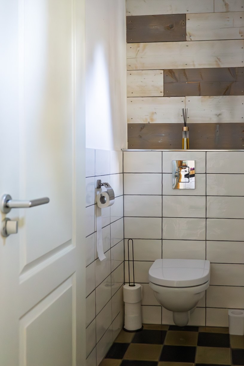 Vanuit de keuken is het toilet toegankelijk. Dit betreft een hangcloset. De afwerking bestaat uit gestucte wanden waarbij de achterwand van het toilet is afgewerkt met steigerplanken. Op de vloer liggen dezelfde, authentieke vloertegels als in de keuken.