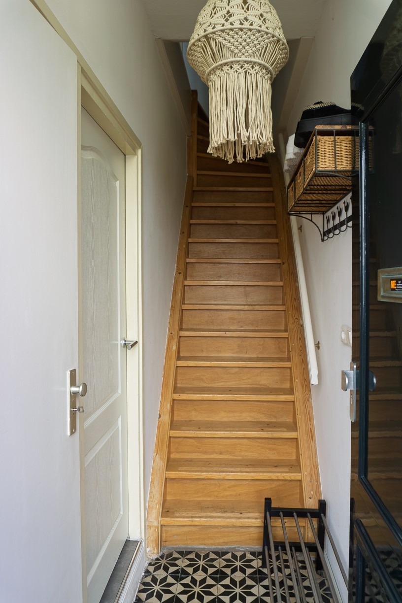 De trapopgang in de hal komt uit op de overloop van de 1e verdieping. De overloop geeft toegang tot 2 slaapkamers en de badkamer.
