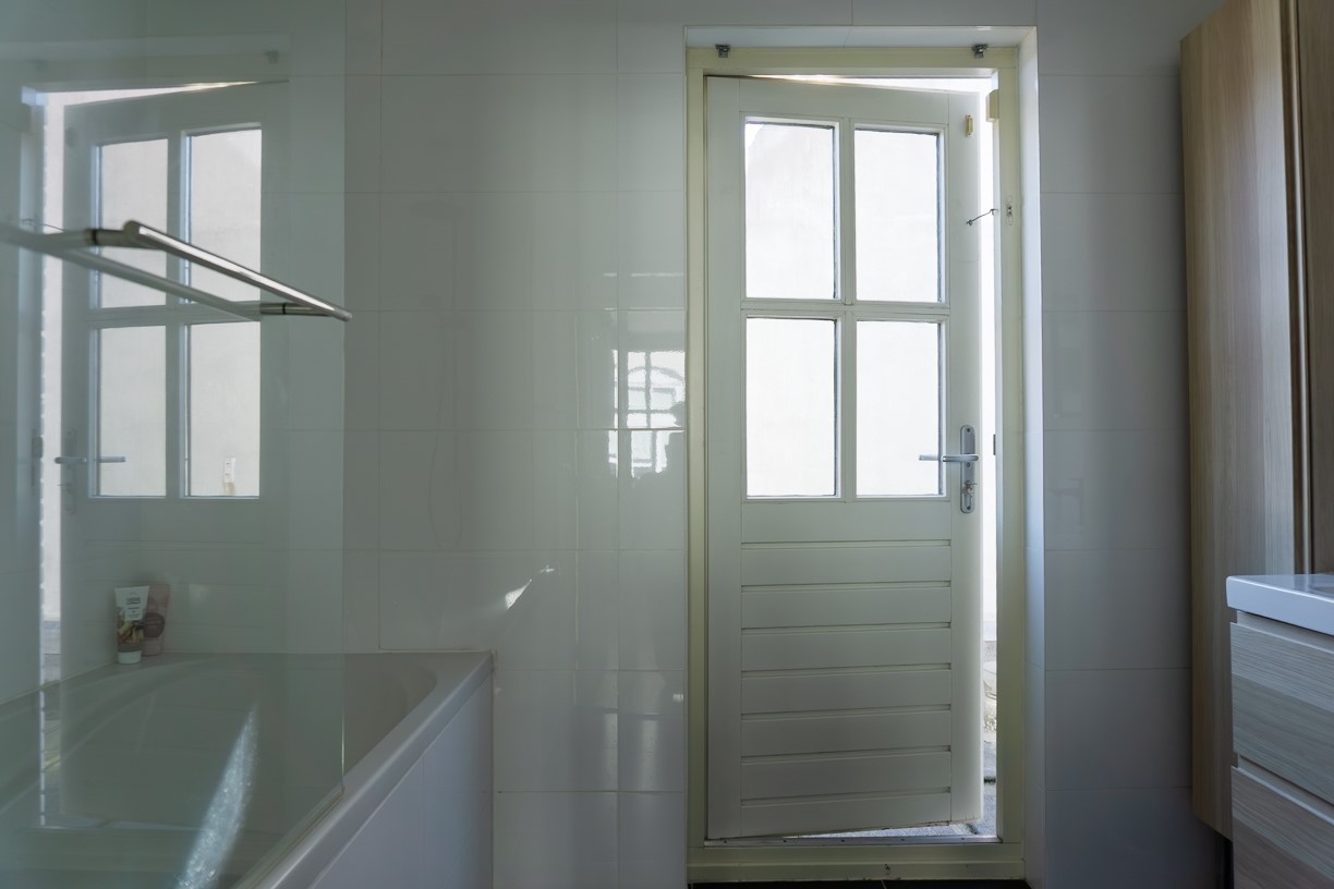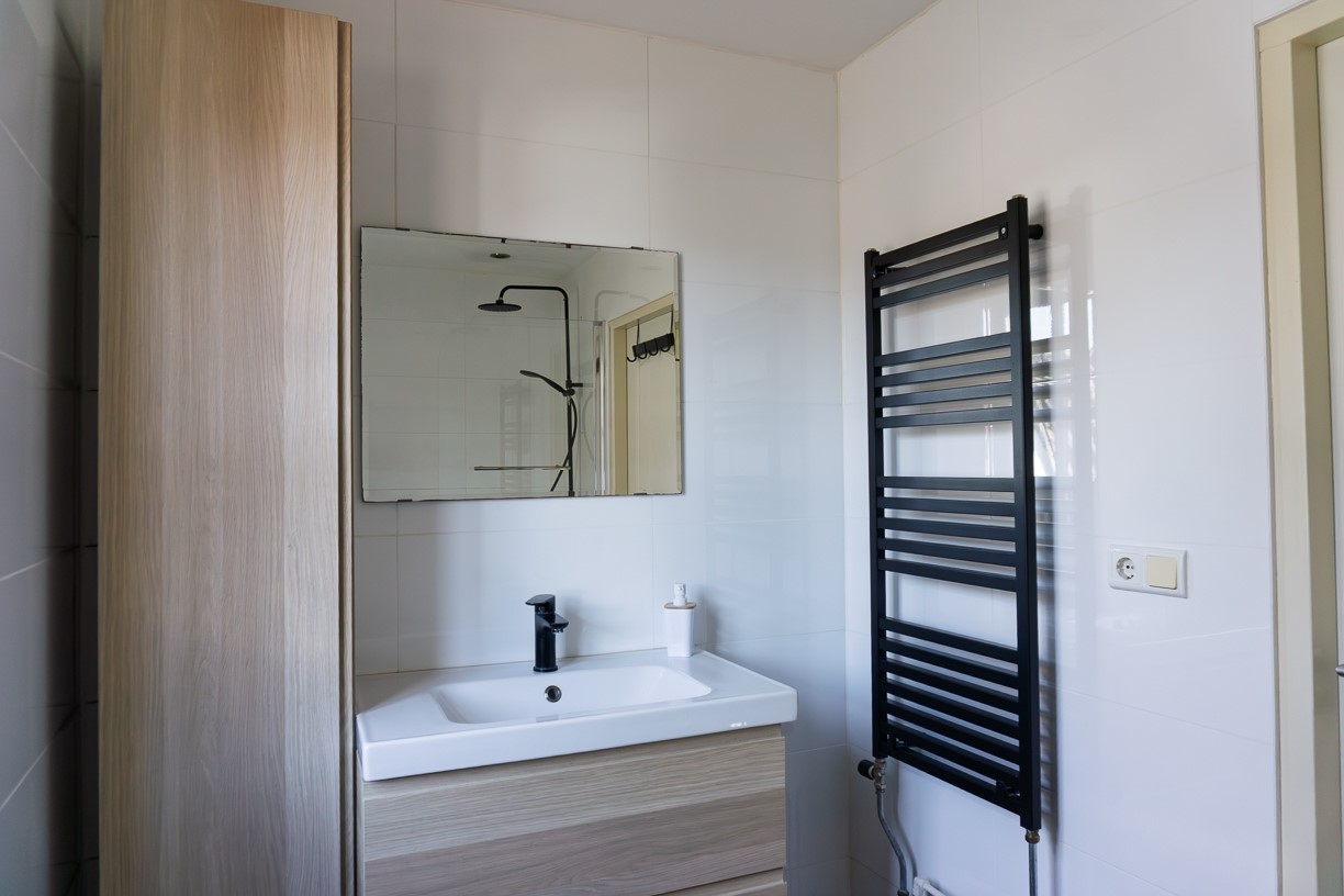 De met een designradiator verwarmde badkamer beschikt over een ligbad met regendouche, een wastafel ingebouwd in een wastafelmeubel met hiernaast een kast voor bijvoorbeeld de handdoeken. Via een balkondeur is er toegang tot het dak boven de keuken. De afwerking van de badkamer bestaat uit betegelde wanden en vloer en een gestuct plafond waarin spots zijn verwerkt.