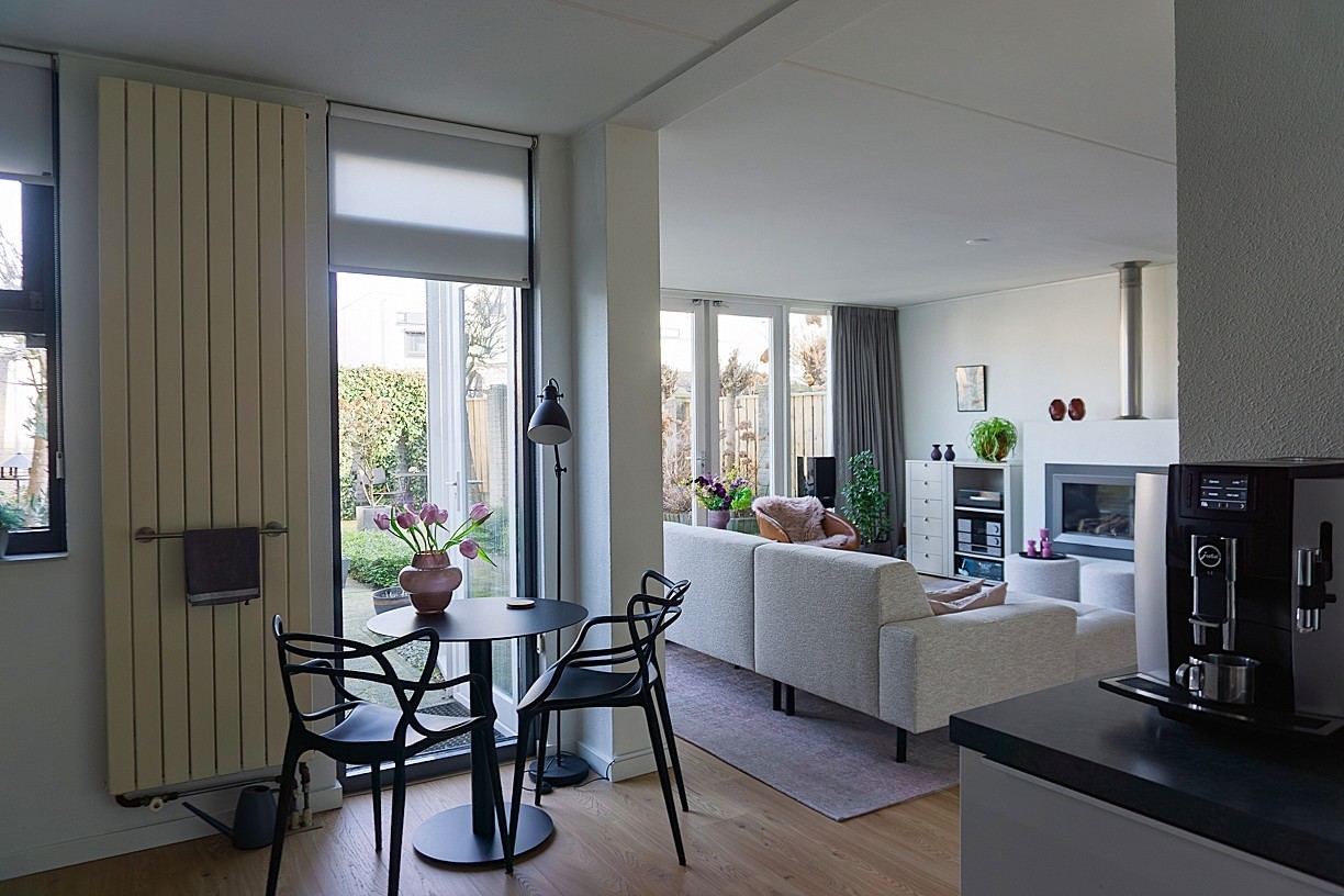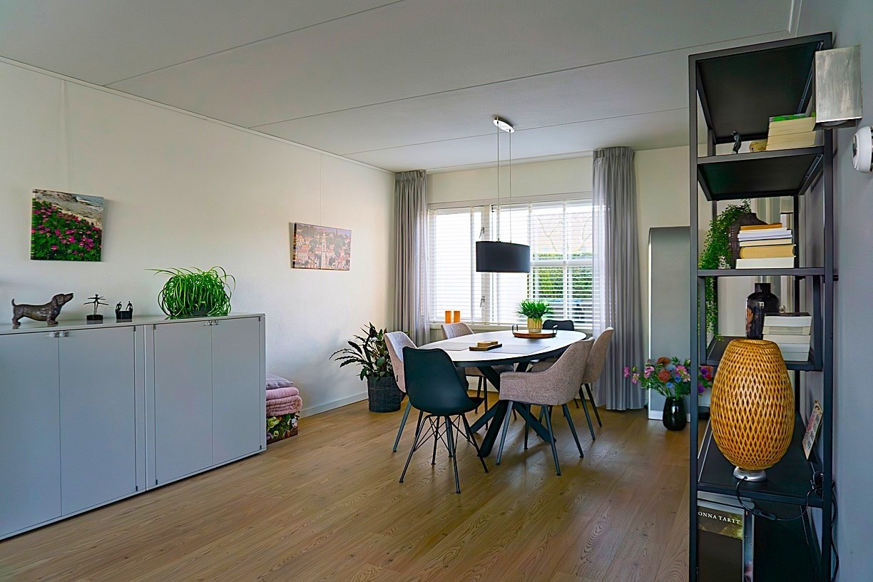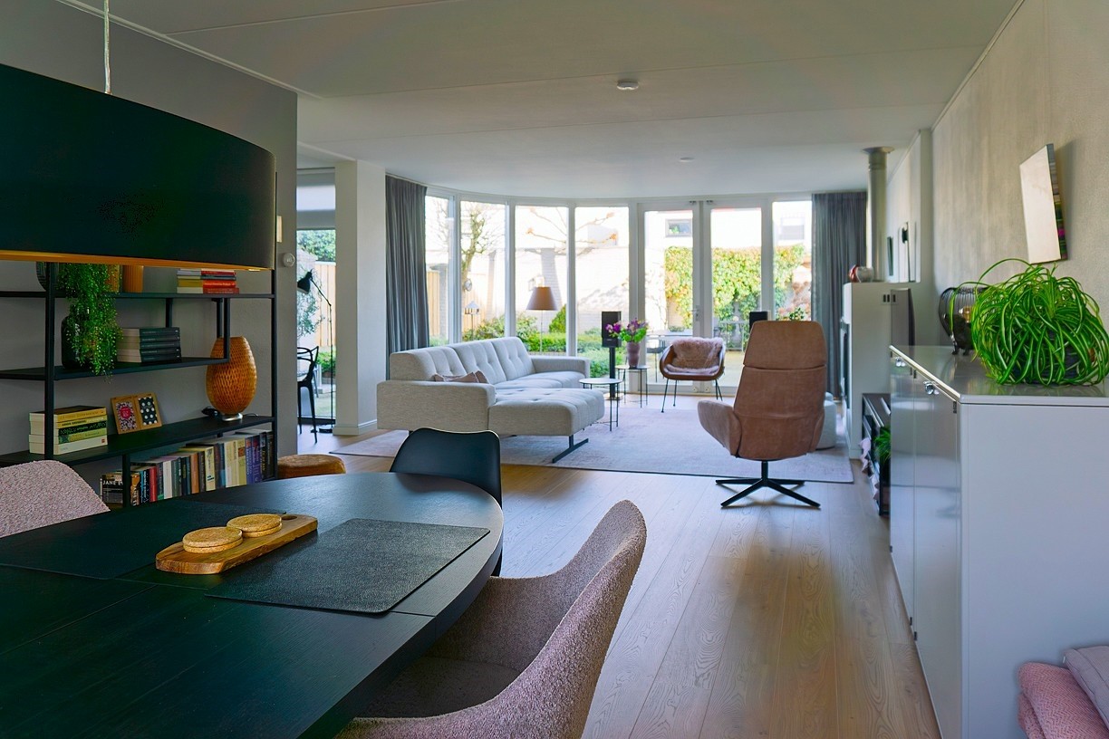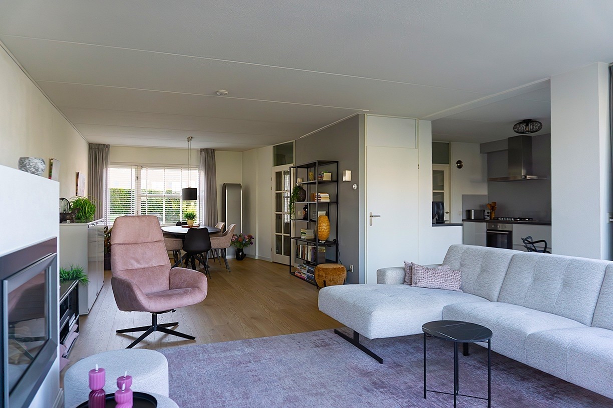 De woonkamer is in 2001 aan de achterzijde uitgebouwd. Door de vele raampartijen kent de woonkamer veel lichtinval. De tuindeuren maken hierbij de verbinding met de nette achtertuin. De uitbouw heeft gezorgd voor een ruime, gezellige woonkamer mede door de aanwezige schouw met gashaard. De woonkamer staat in open verbinding met de keuken. Op de scheiding van de keuken en de woonkamer is een ruime vaste bergkast (onder de trap) aanwezig. De woonkamer is afgewerkt met gespoten wanden en plafond. Op de vloer van de woonkamer ligt een nette, vernieuwde (2024) laminaatvloer.