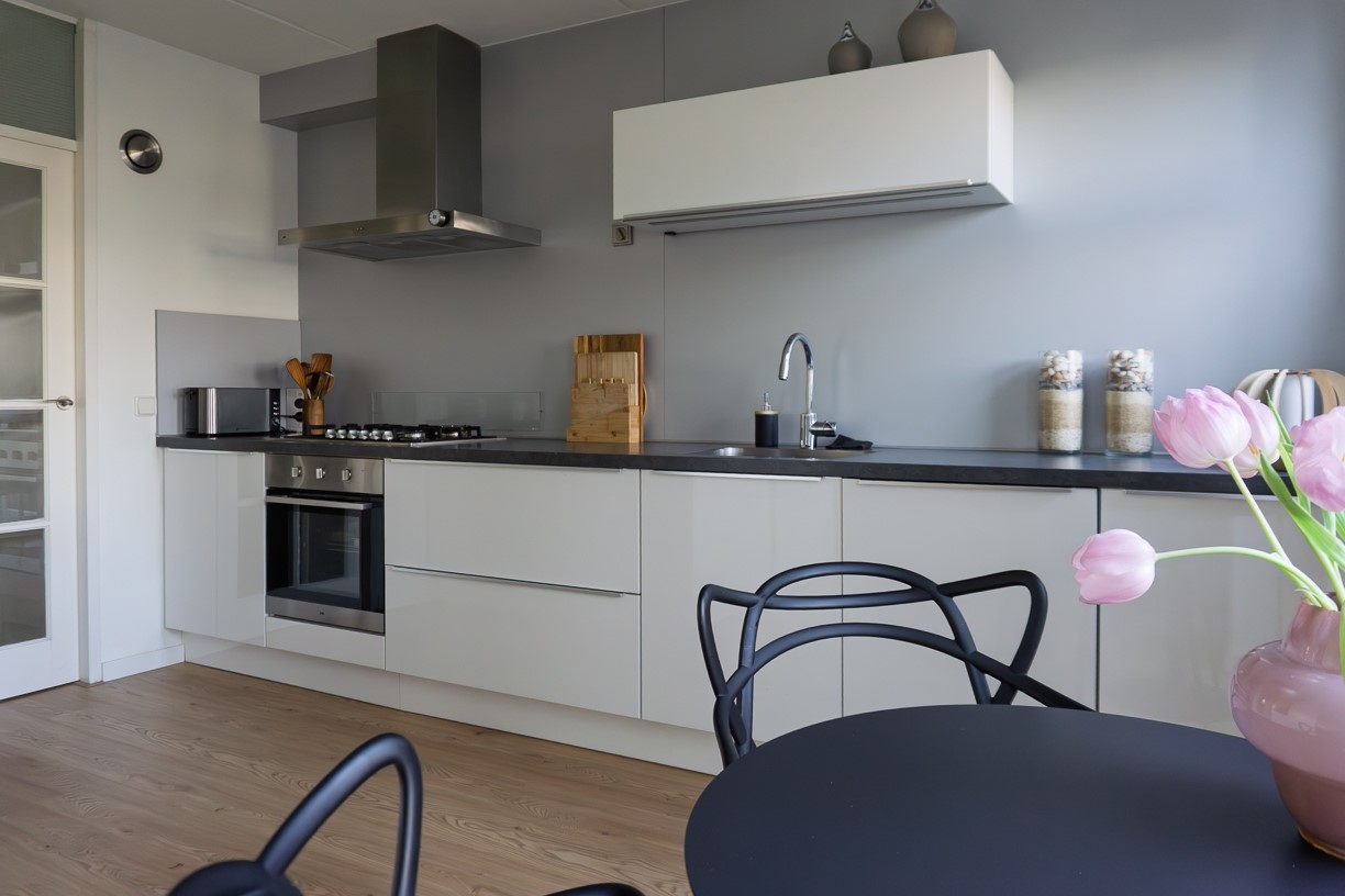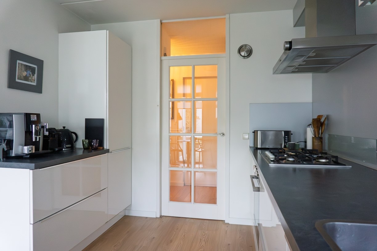 De open keuken is naast de woonkamer gelegen en is ook vanuit de hal toegankelijk. De keuken, die in 2016 is vernieuwd, is in 2 delen langs de wanden opgesteld. De keuken beschikt over lades, onder- en bovenkasten, een kunststof werkblad met spoelbak en een mengkraan. Ingebouwd zijn een 5-pits gaskookplaat met hierboven de afzuigkap, een combi-oven/grill, een vaatwasser en aan de andere zijde een koel-vries combinatie. De achterwand tussen werkblad en bovenkasten is afgewerkt met afwasbaar plaatmateriaal. Verder is de afwerking van wanden, vloer en plafond gelijk aan de afwerking van de woonkamer.