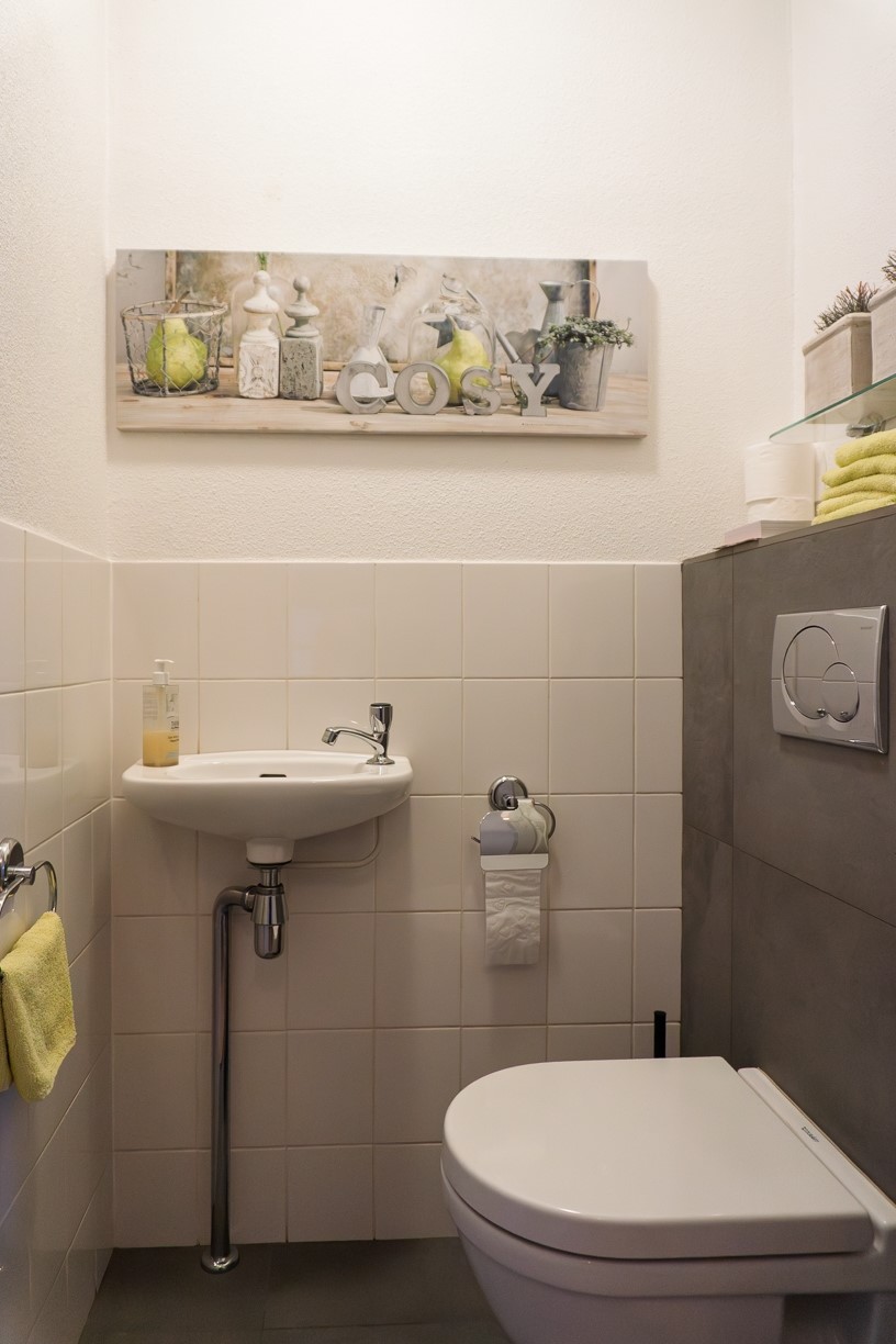 Het toilet in de hal beschikt over een hangcloset en fontein. De vloer en de wanden zijn tot halve hoogte betegeld. Hierboven zijn de wanden en het plafond afgewerkt met spuitwerk.