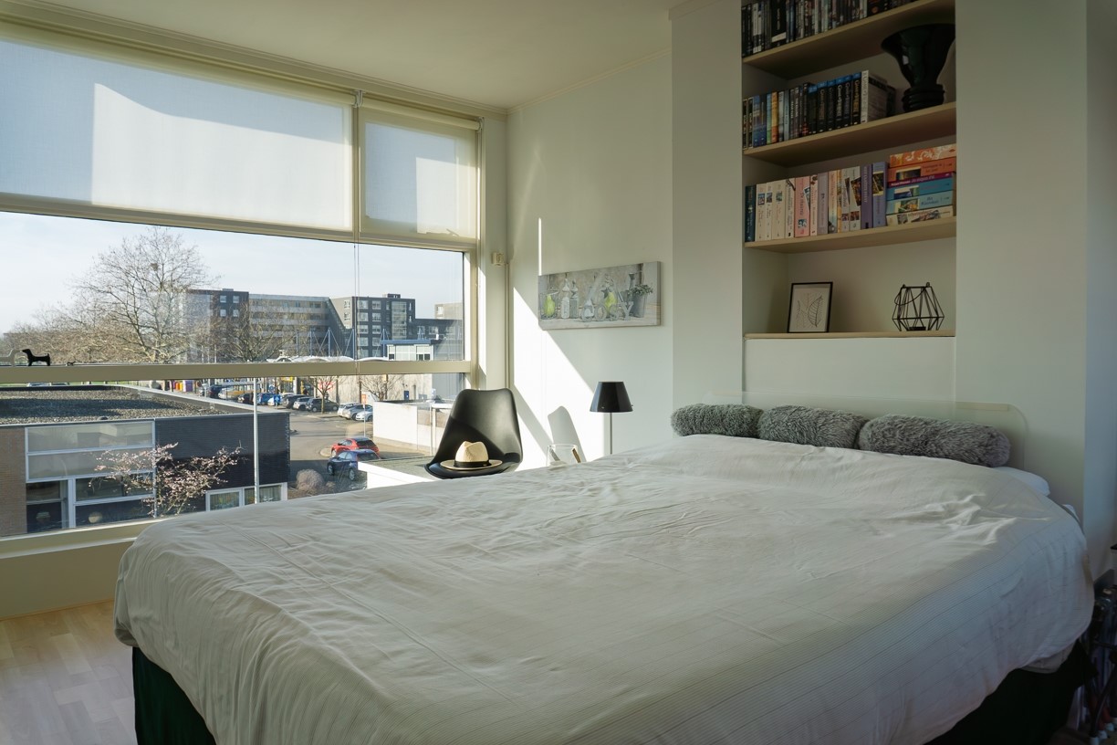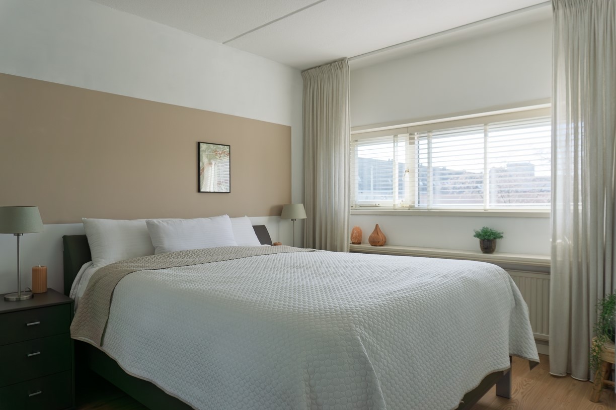 Deze ruime kamer is gelegen onder het dak. Omdat zowel aan de voorzijde als aan de achterzijde een groot raam aanwezig is, is er veel licht in deze slaapkamer. De wanden en het plafond zijn afgewerkt met stucwerk en op de vloer ligt laminaat.