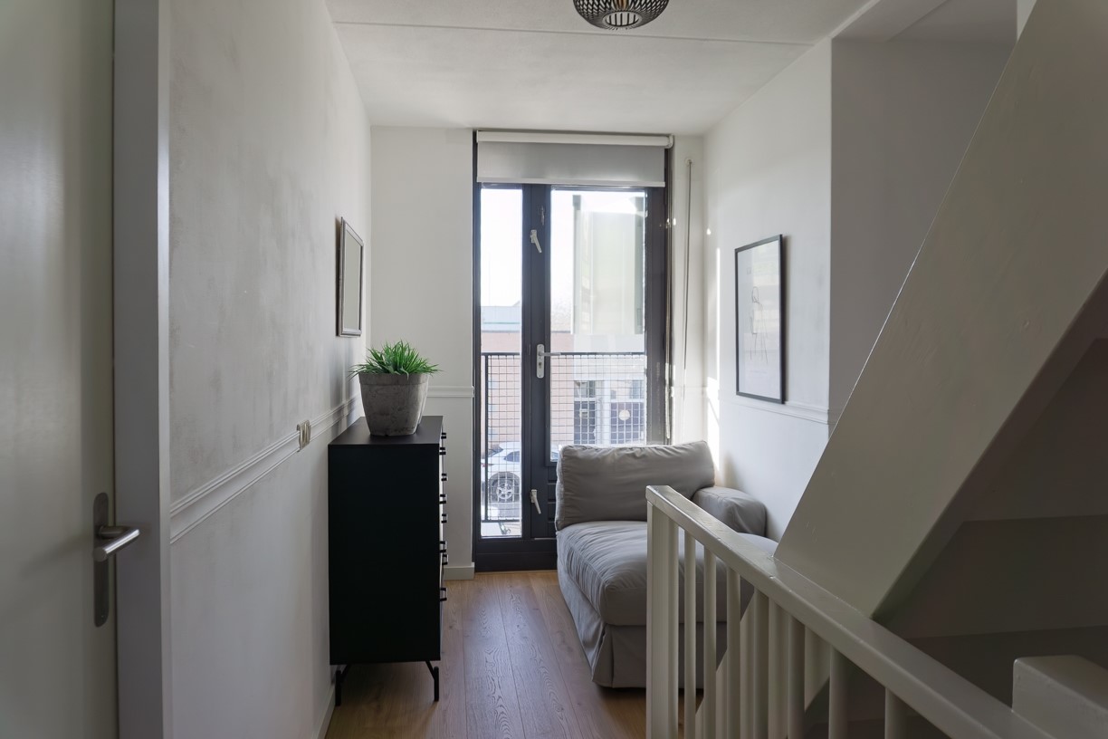 De fraai beklede trapopgang in de hal komt uit op de ruime U-vormige overloop van de 1e verdieping. Deze is speels vormgegeven met aan de voorzijde van de overloop een frans balkon. De overloop geeft toegang tot 3 slaapkamers, de wasruimte en de badkamer.
