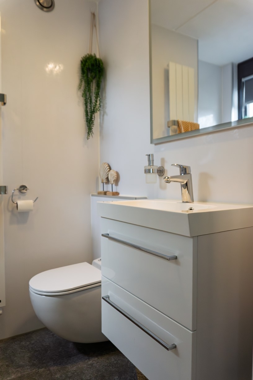 Deze is aan de voorzijde van de woning gelegen en in 2020 vernieuwd. De met een designradiator verwarmde badkamer is uitgerust met een ligbad, een hangtoilet (Sanibroyeur) en een badmeubel met ingebouwde wastafel en spiegel. De wanden zijn afgewerkt met plaatmateriaal, de vloer is betegeld en het plafond is afgewerkt met spuitwerk.