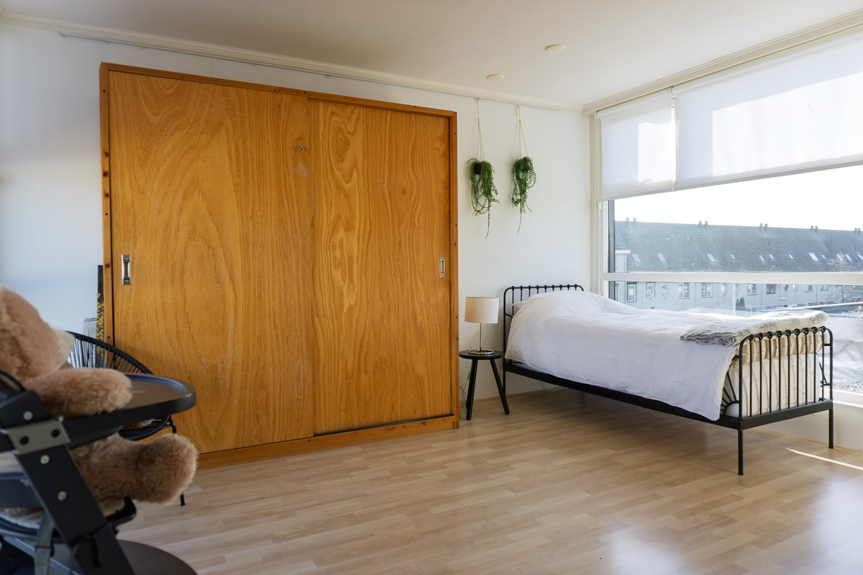 Deze slaapkamer is aan de voorzijde van de woning gelegen. Een vaste kast voor kleding is aanwezig. De wanden zijn afgewerkt met stucwerk en het plafond is afgewerkt met spuitwerk. Op de vloer ligt laminaat.