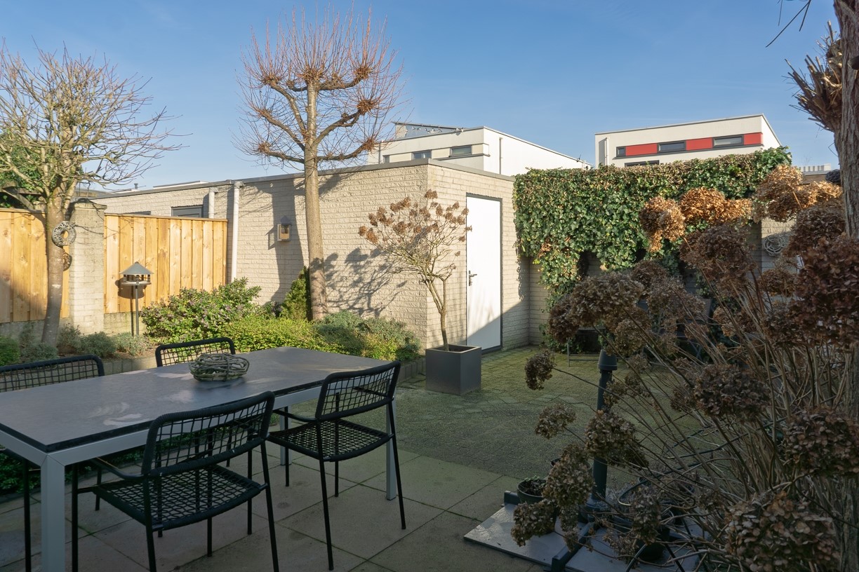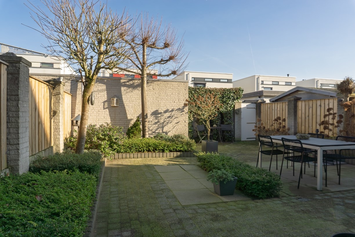 De achter de woning gelegen tuin is gericht op het oosten en is netjes onderhouden. Door de ligging van de tuin heb je het grootste deel van de dag veel zon in de tuin. De tuin is aangelegd met bestrating, plantenborders en enkele bomen. Achter in de tuin staat de berging. De tuin is omheind met een houten schutting (vernieuwd in 2024) tussen stenen pinanten en heeft een achterom die uitkomt op de achter de woning gelegen brandgang.