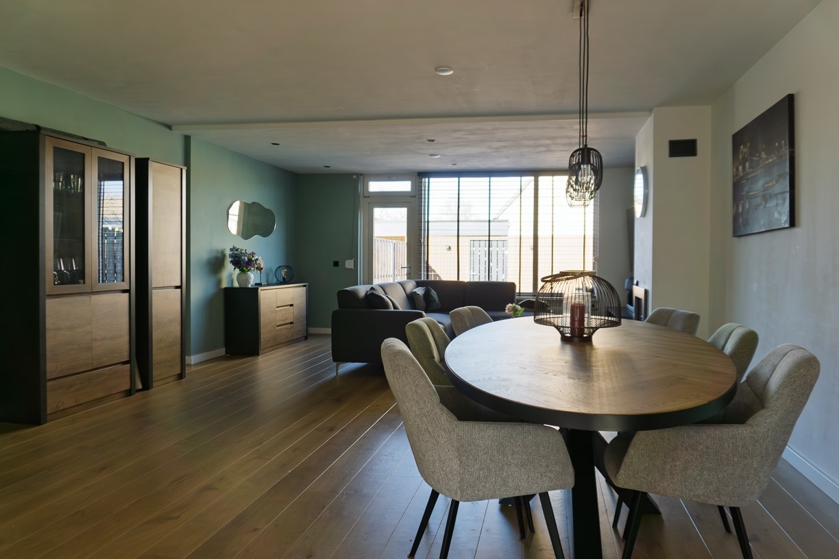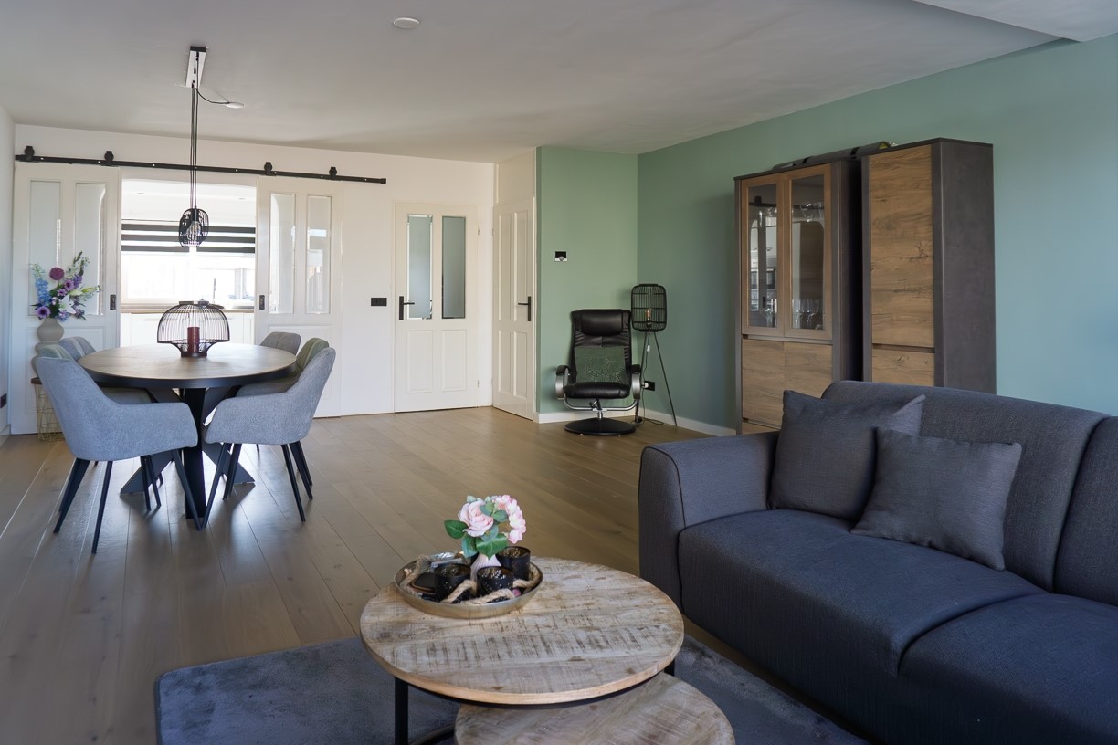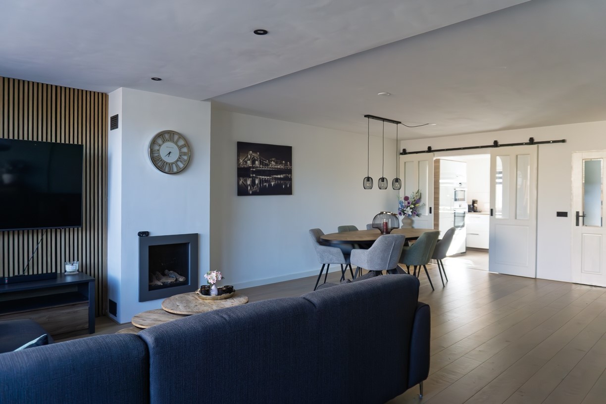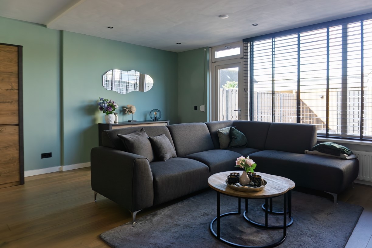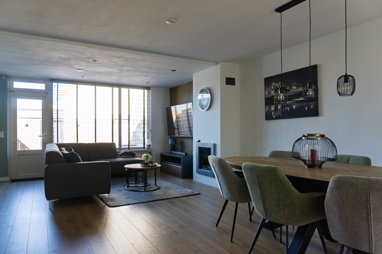 Vanuit de hal kom je in de royale woonkamer. Door de uitbouw aan de achterzijde is het een heerlijke ruimte om rondom de gashaard een zithoek te creëren. Hiernaast is er meer dan voldoende ruimte om een eethoek te plaatsen. Vanuit de woonkamer is het mogelijk om de achtertuin in te lopen via een tuindeur. Op de scheiding van de woonkamer en de (halfopen) keuken zijn schuifdeuren aangebracht die de woonkamer kunnen afsluiten van de keuken. De wanden van de woonkamer zijn afgewerkt met strak stucwerk en het plafond met spuitwerk. Op de vloer ligt een eikenhouten plankenvloer.