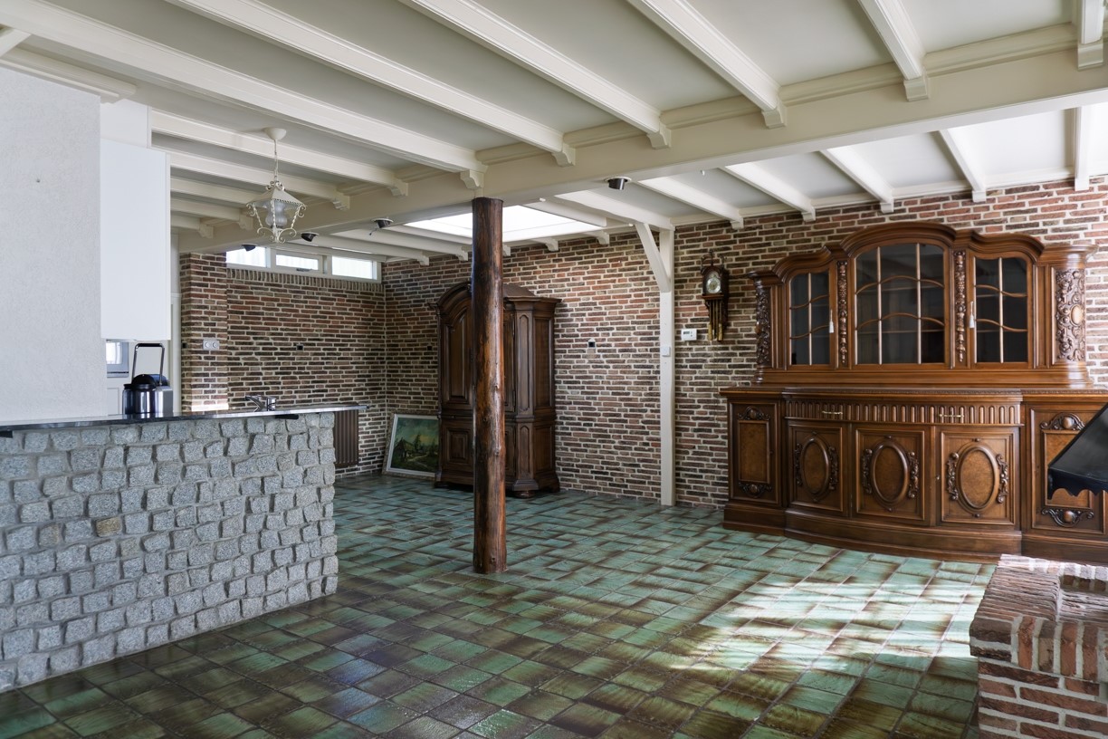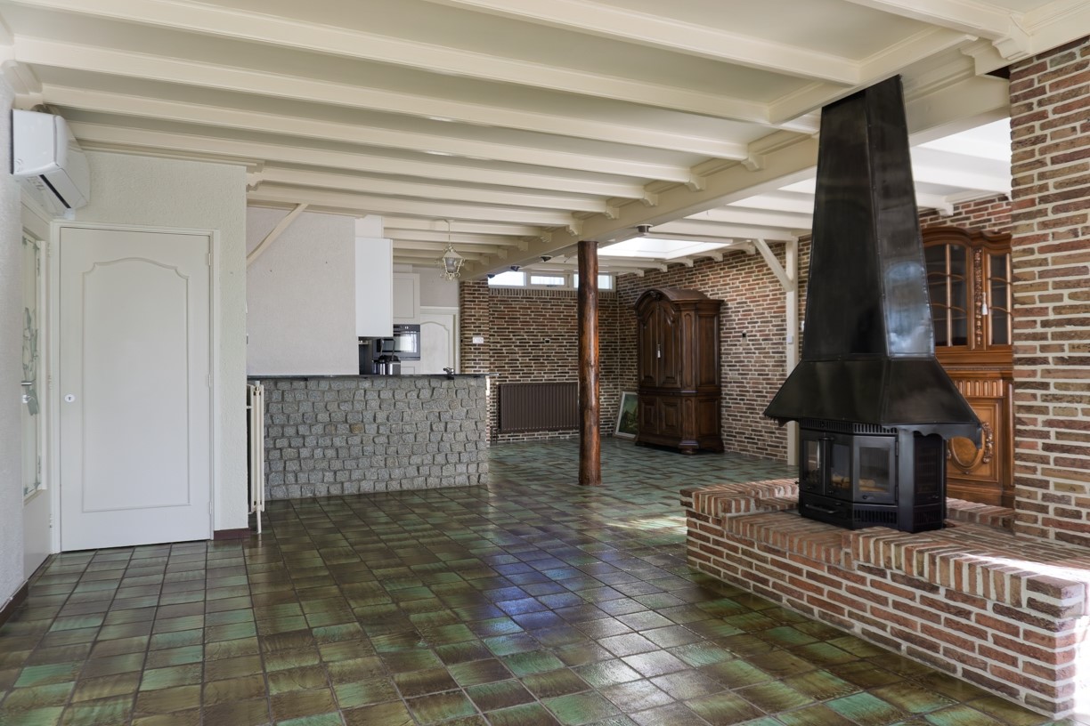 Vanuit de hal wordt de ruime woonkamer betreden. De woonkamer staat in open verbinding met de keuken en beschikt over een schouwpartij met houtkachel. De woonkamer beschikt over airco en een lichtkoepel die zorgt voor voldoende lichtinval in de hele kamer. In de hoek van de kamer is een meterkast aanwezig. Deze gemoderniseerde meterkast beschikt over 5 elektragroepen, 3 aardlekschakelaars en een PV groep. De woonkamer is afgewerkt met een betegelde vloer, deels wanden met granol en deels met schoon metselwerk en een gipskartonplaten plafond waaronder sierbalken zijn aangebracht.
