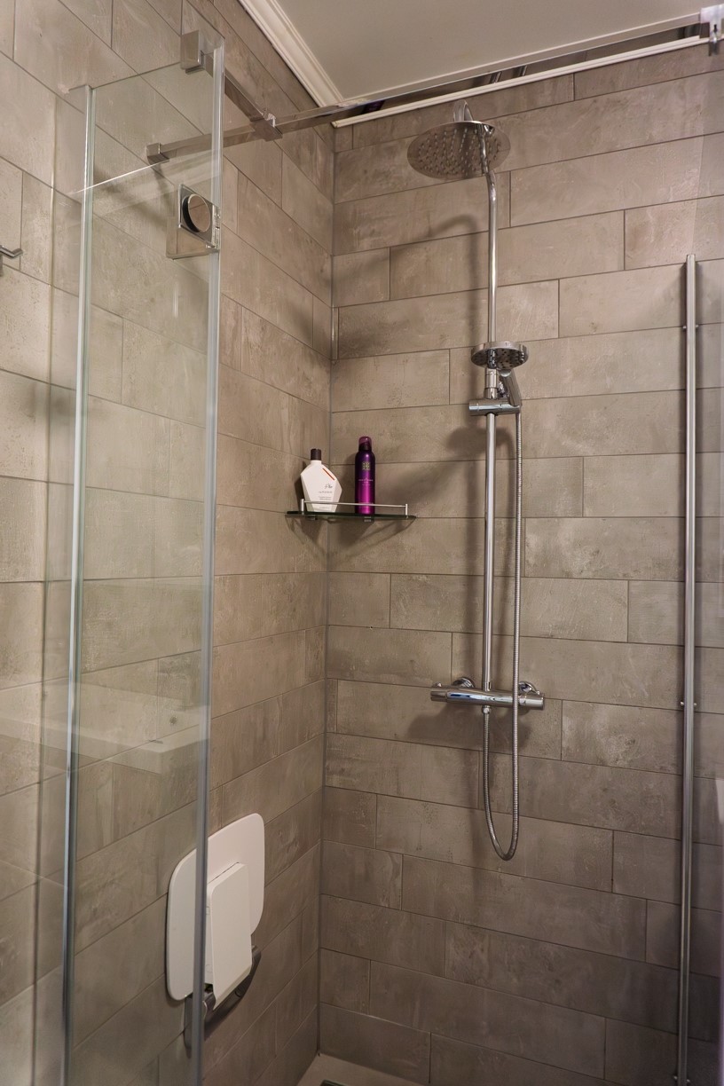 De gemoderniseerde badkamer is gesitueerd tussen slaapkamer 1 en 2 en beschikt over een ligbad, inloopdouche en een dubbele wastafel ingebouwd in een fraai badmeubel. De wanden en de vloer van de badkamer zijn in neutrale kleuren betegeld. Het plafond betreft een spanplafond.